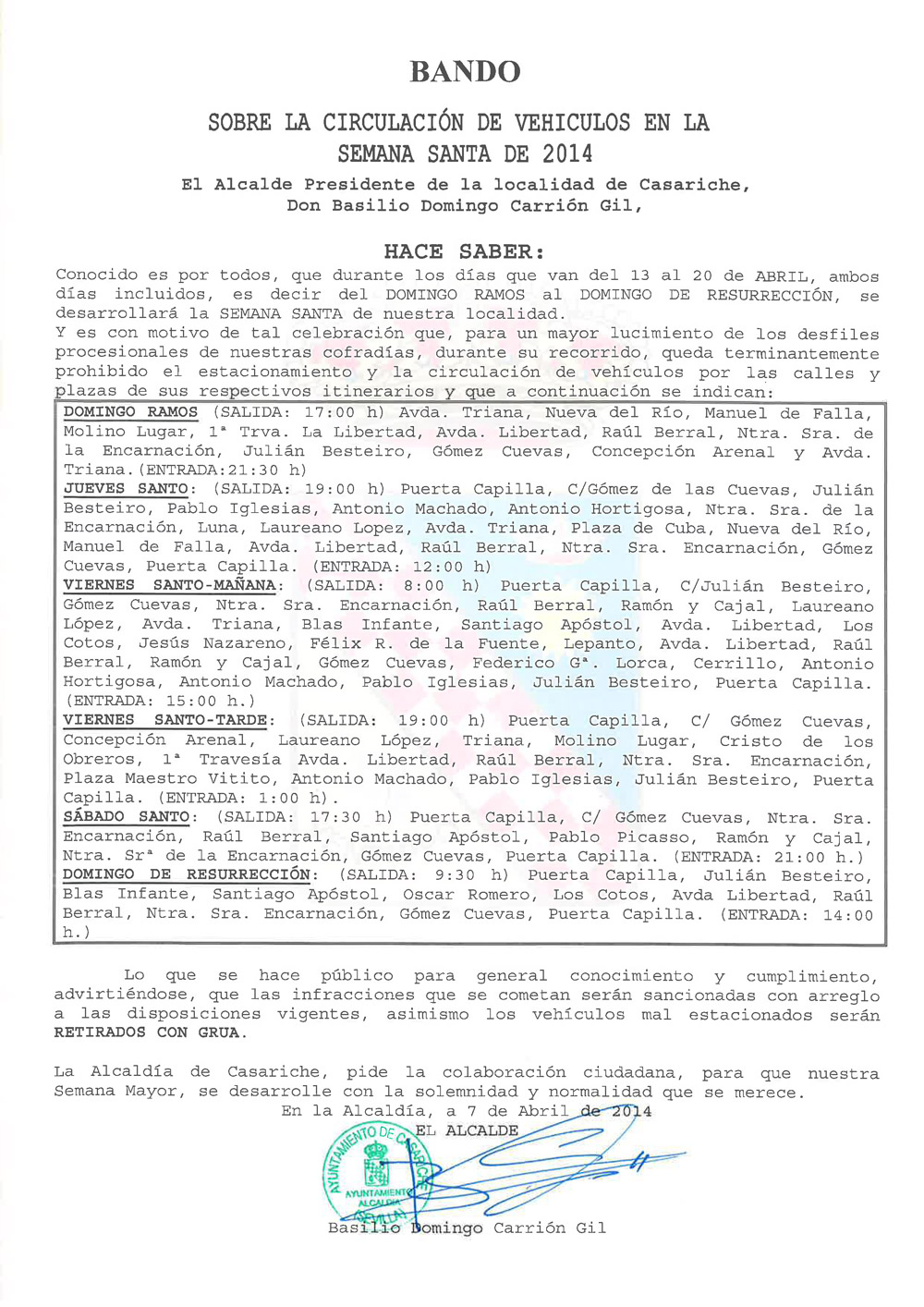 Por este motivo, y para mayor lucimiento de los desfiles procesionales de las Hermandades de nuestro pueblo se lanza el siguiente Bando que afecta a la circulación y estacionamiento de l0s vehículos durante los días indicados (haz clic sobre la imagen para verla más grande).