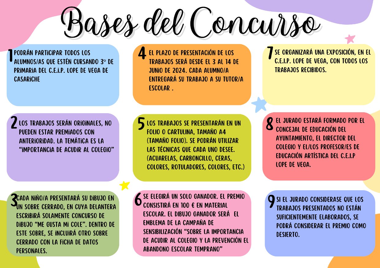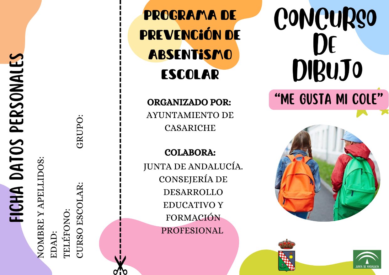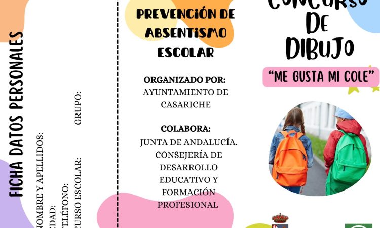 El Ayuntamiento de Casariche, a través del programa de prevención de absentismo escolar del curso 2023-2024, ha organizado un concurso de dibujo dirigido al alumnado de 3º de primaria del CEIP Lope de Vega, cuya temática es la importancia de acudir al colegio.