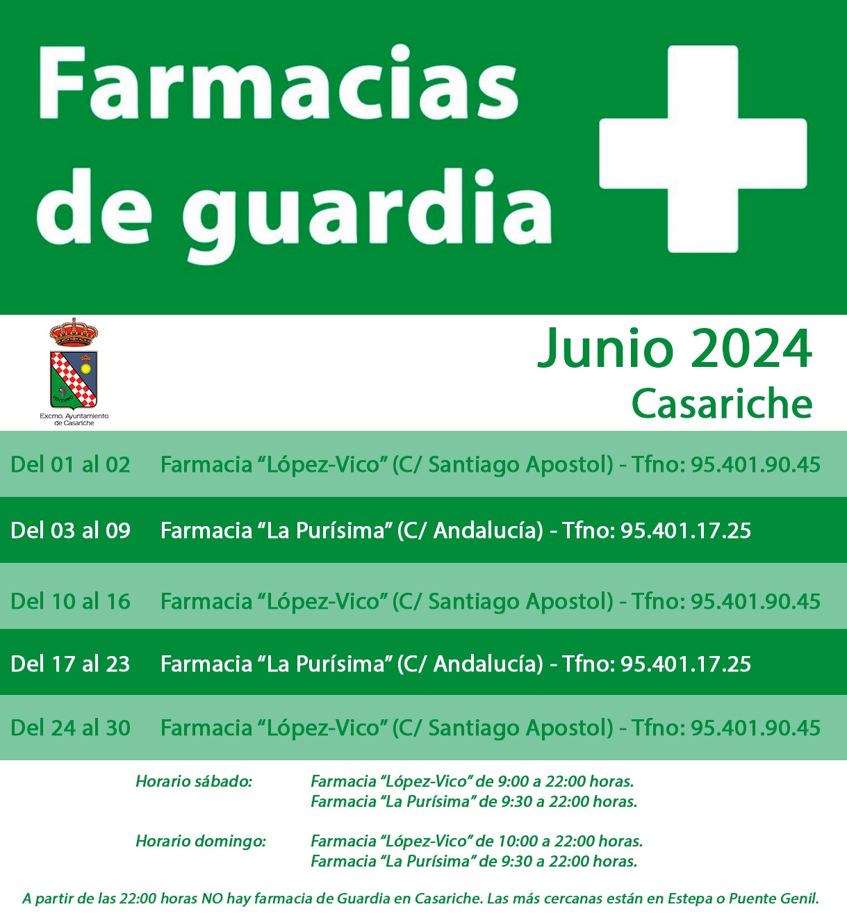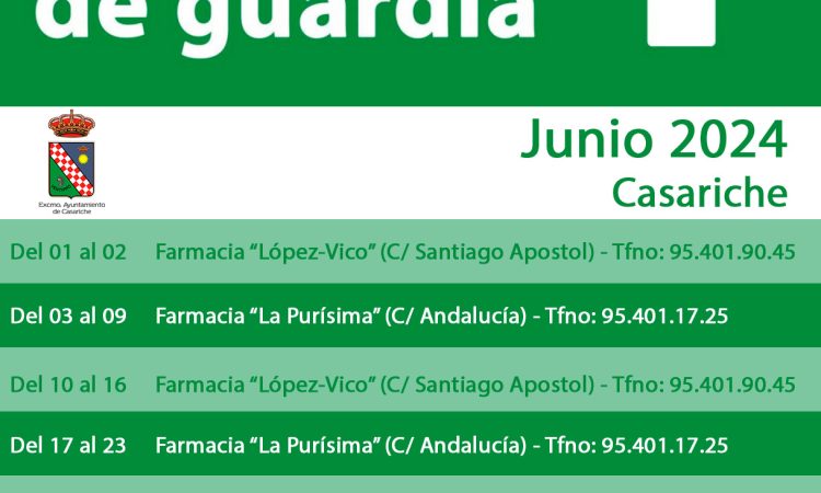 Este primer fin de semana de junio estará de guardia la farmacia «López – Vico», ubicada en la calle Santiago Apóstol. Su horario de apertura será de 09:00h de la mañana a 22:00h de la noche el sábado y de 10:00h de la mañana a 22:00h de la noche el domingo.