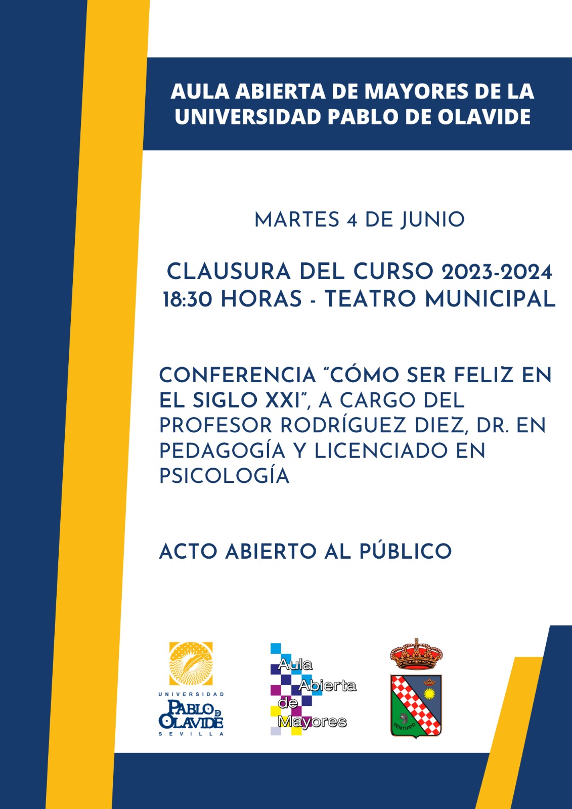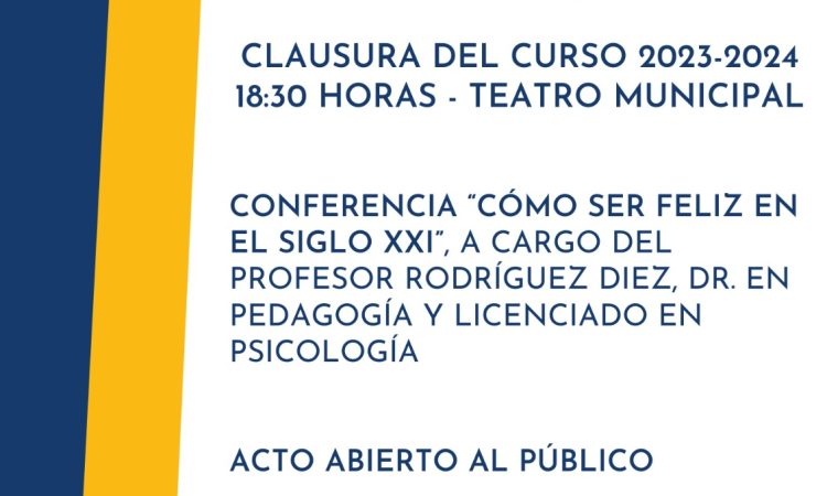 Este acto, que está abierto al público, incluirá la conferencia ‘Cómo ser feliz en el Siglo XXI’, a cargo del Profesor Rodríguez Díez, Doctor en Pedagogía y Licenciado en Psicología.