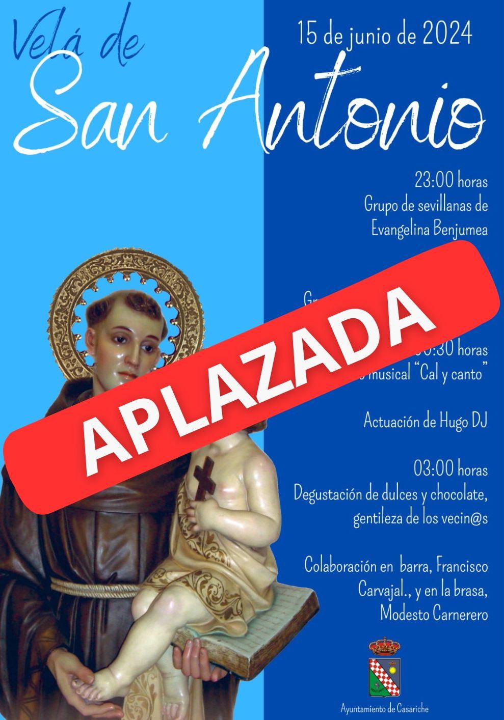 Informamos que la Velá de San Antonio, cuya celebración estaba prevista para este sábado 15 de junio, ha sido aplazada.
