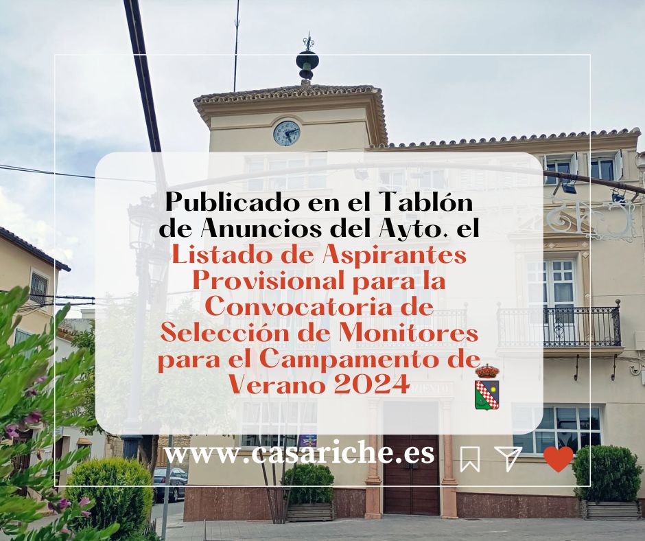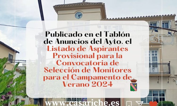 Desde la Delegación de Empleo informamos a todos los vecinos y vecinas de Casariche que ya está disponible, tanto en el Tablón de Anuncios de nuestro Ayuntamiento como en el E-tablón, la Relación Provisional de Aspirantes para la Convocatoria para la Selección de Monitores para el Campamento de Verano 2024