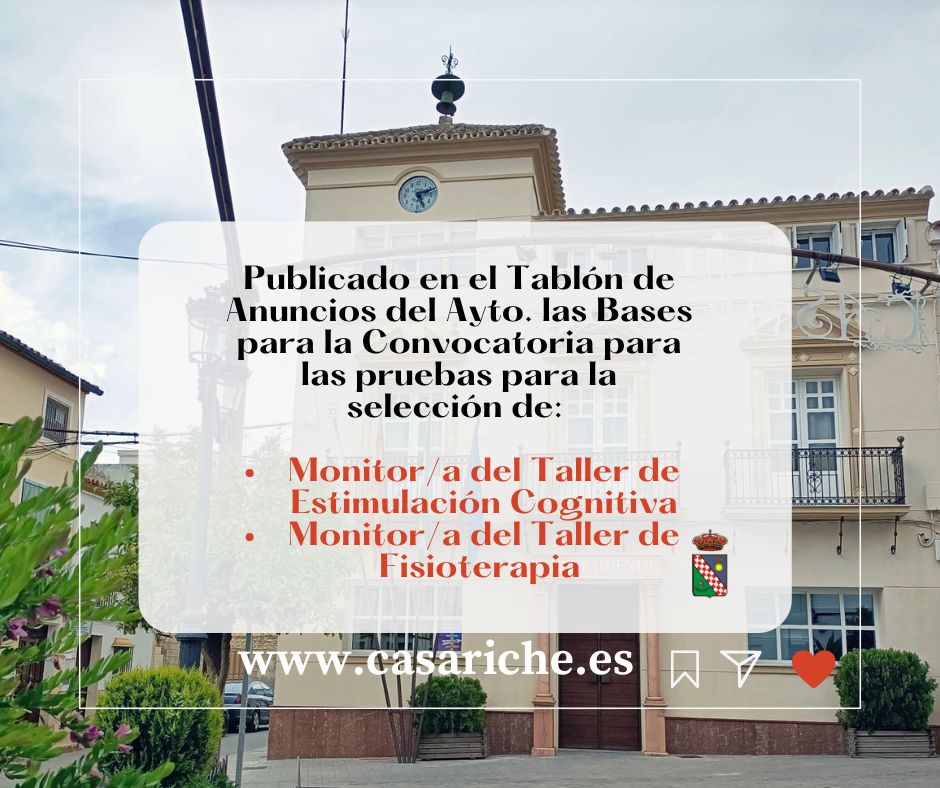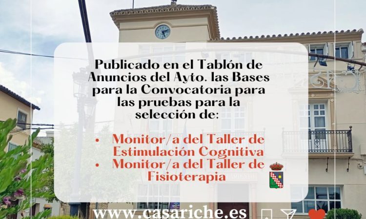 Desde la Delegación de Empleo informamos que ya se pueden consultar en el Tablón de Anuncios del Ayuntamiento y en el E- Tablón las Bases de las Convocatorias de las Pruebas Selectivas para la Selección de Monitor/a de Taller de Estimulación Cognitiva y Monitor/a de Taller de Fisioterapia, pertenecientes ambos al ‘Programa de Envejecimiento Activo de Casariche’, subvencionado por la Diputación de Sevilla.