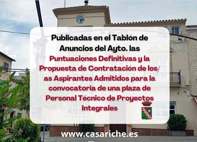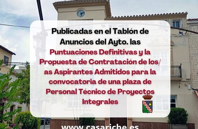 Desde la Delegación de Empleo informamos a todos los vecinos y vecinas de Casariche que ya están disponibles, tanto en el Tablón de Anuncios de nuestro Ayuntamiento como en el E-tablón, las Puntuaciones Definitivas de y la Propuesta de Contratación de los/as Aspirantes Admitidos para la convocatoria de una plaza de Personal Técnico de Proyectos Integrales para la inserción laboral de colectivos vulnerables del Ayuntamiento de Casariche.