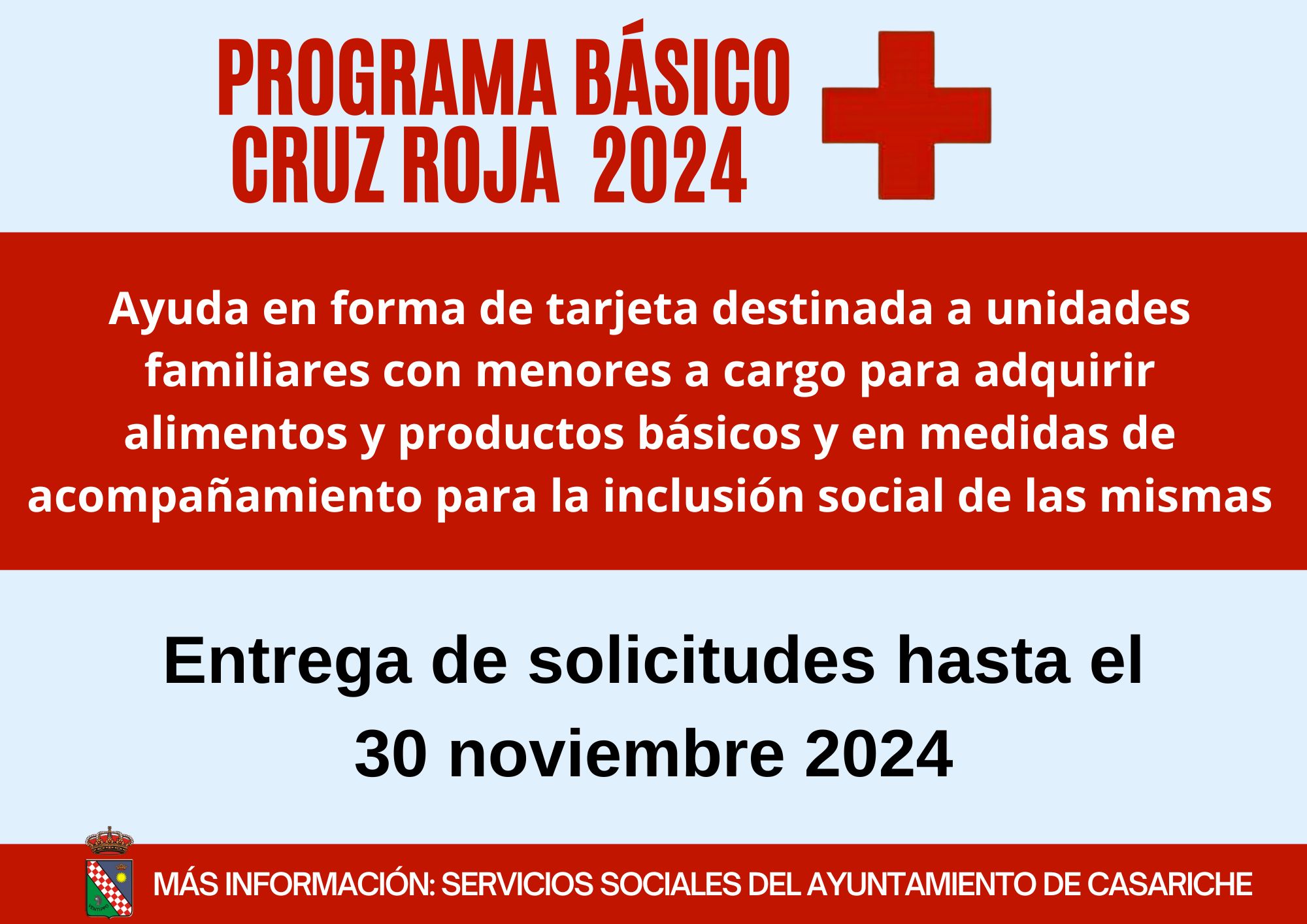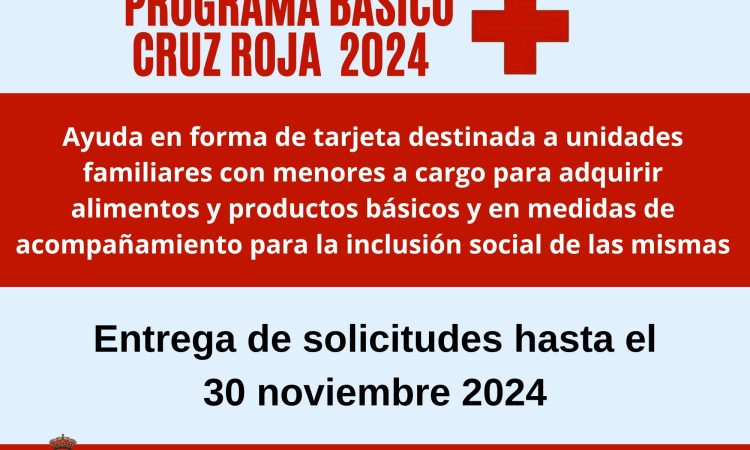 Desde la Delegación de Bienestar Social de nuestro Ayuntamiento, se informa que el plazo de entrega de solicitudes para acogerse al Programa Básico de Cruz Roja 2024 estará abierto hasta el 30 de noviembre.