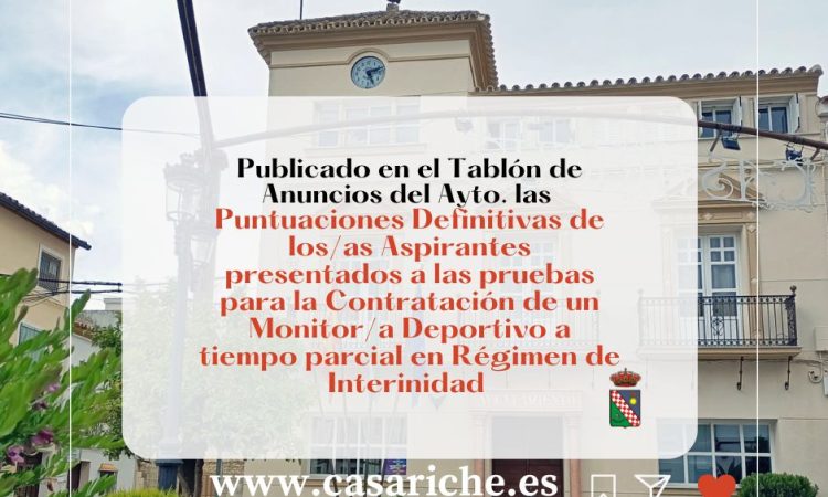 Desde la Delegación de Empleo informamos a todos los vecinos y vecinas de Casariche que ya están disponibles, tanto en el Tablón de Anuncios de nuestro Ayuntamiento como en el E-tablón, las Puntuaciones Definitivas de los/as Aspirantes Admitidos para la convocatoria de contratación de un Monitor/a Deportivo a tiempo parcial (25 horas/ semana) en régimen de interinidad con el objetivo de sustituir a la persona titular del servicio por excedencia