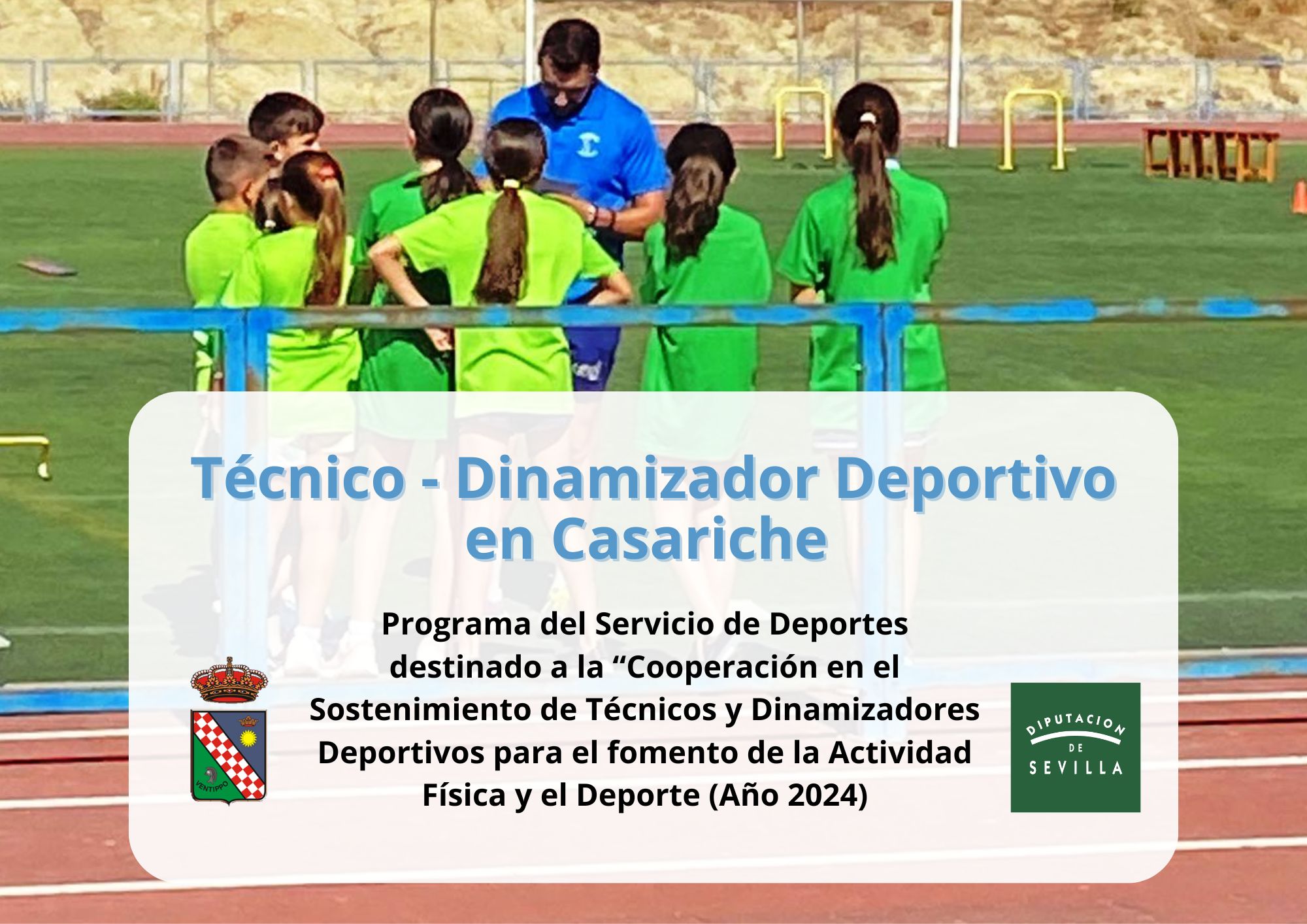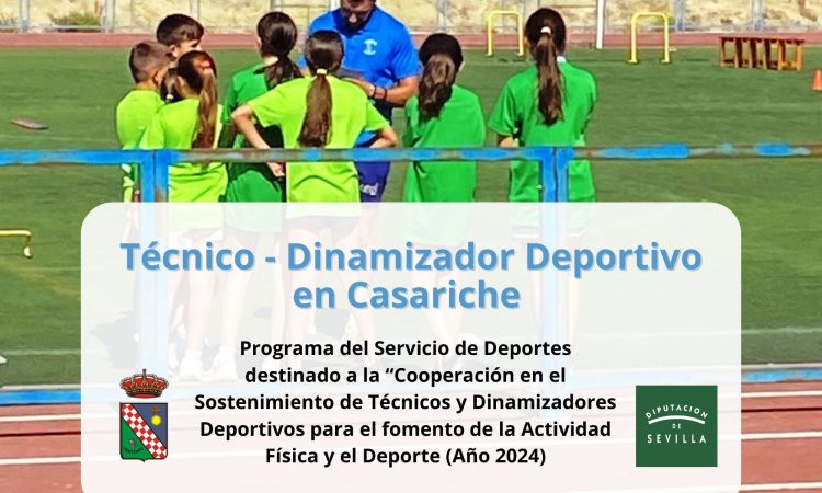 En este año 2024, hemos vuelto a contar con un Técnico-Dinamizador Deportivo en Casariche, gracias a una subvención de 6.000 € de la Excma. Diputación Provincial de Sevilla, enmarcada en el Programa del Servicio de Deportes destinado a la “Cooperación en el Sostenimiento de Técnicos y Dinamizadores Deportivos para el fomento de la Actividad Física y el Deporte (Año 2024)”.
