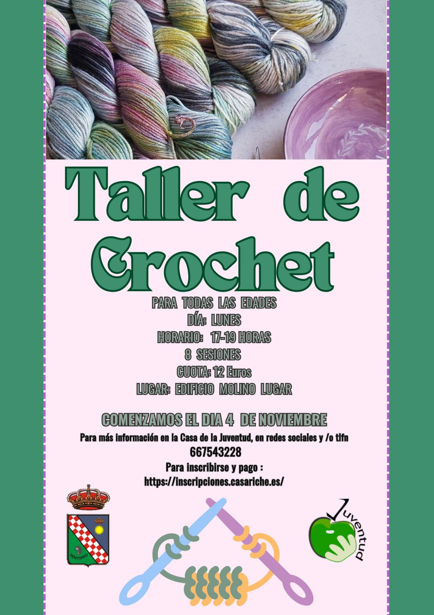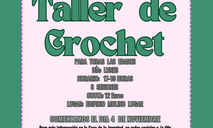 Este taller se impartirá cada lunes de 17:00h a 19:00h en el edificio Molino Lugar y constará de un total de 8 sesiones, siendo el coste del mismo de 12€ por persona.