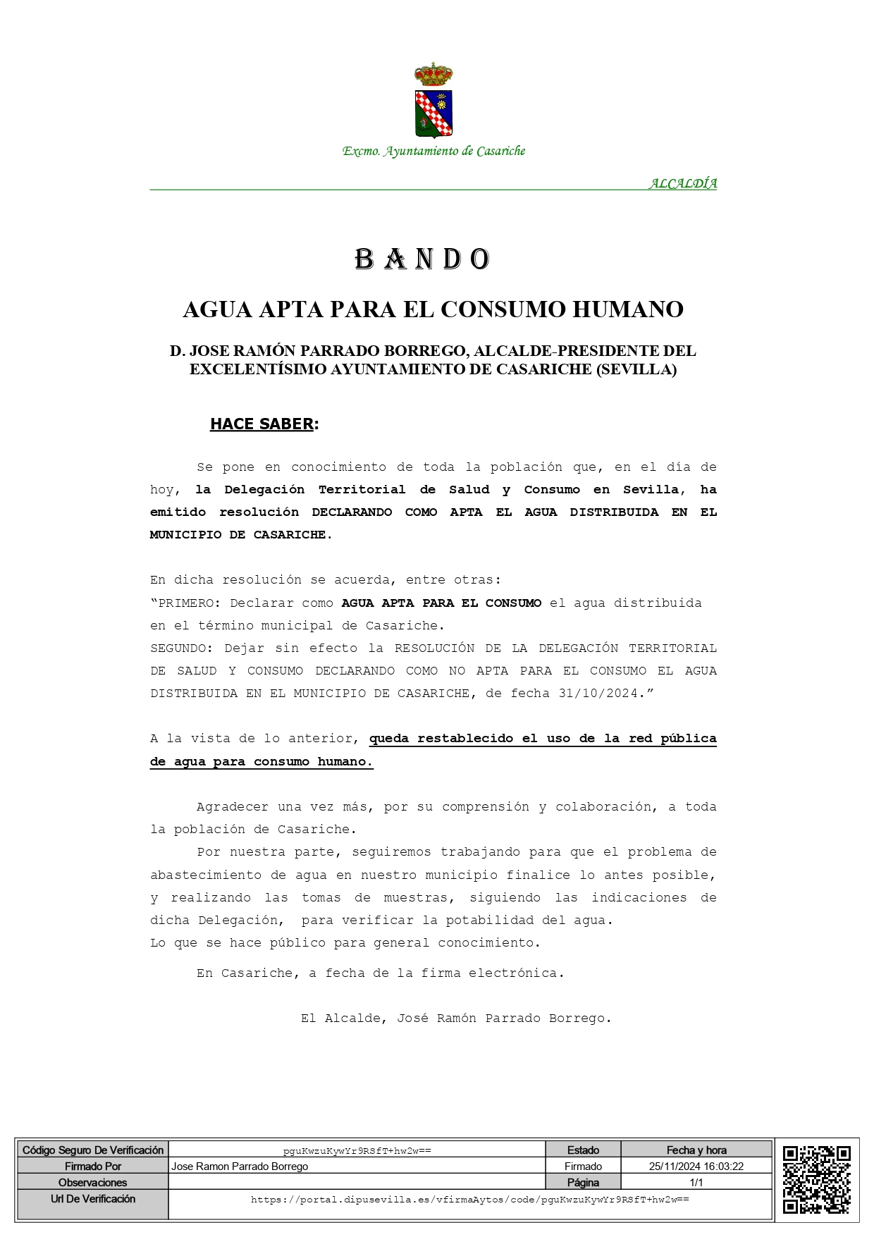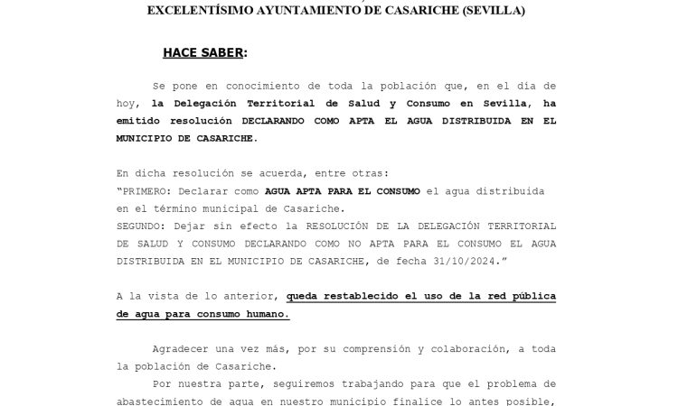 Informamos que la Delegación Territorial de Salud y Consumo en Sevilla, ha emitido resolución DECLARANDO COMO APTA EL AGUA DISTRIBUIDA EN EL MUNICIPIO DE CASARICHE.