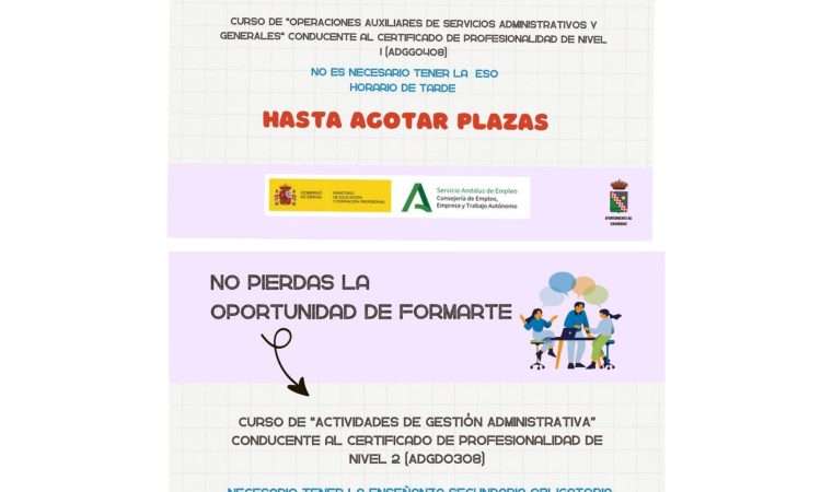 - Curso ‘Operaciones Auxiliares de Servicios Administrativos y Generales’, conducente a la obtención del Certificado de Profesionalidad de Nivel 1 (ADGD0408). Se trata de un curso de 390 horas que se impartirá en horario de tarde. No es necesario tener la ESO para poder optar a este curso y su fecha de inicio prevista es el 3 de marzo de 2025.