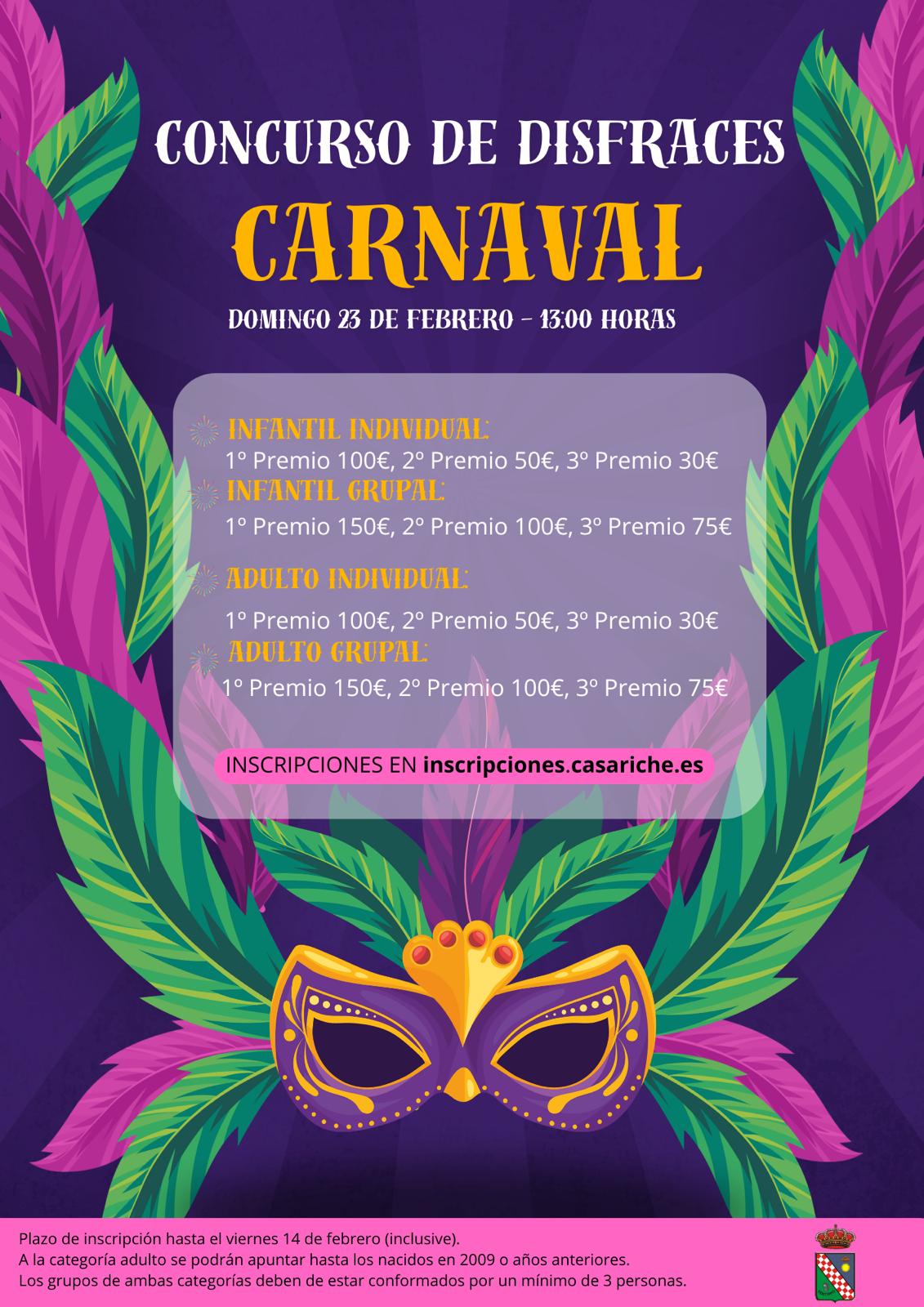 Comenzamos hoy con la apertura del plazo de inscripciones para participar en el Concurso de Disfraces de Carnaval, que se celebrará el domingo 23 de febrero a las 13:00 horas en la Calligüela y constará de las siguientes categorías y premios: