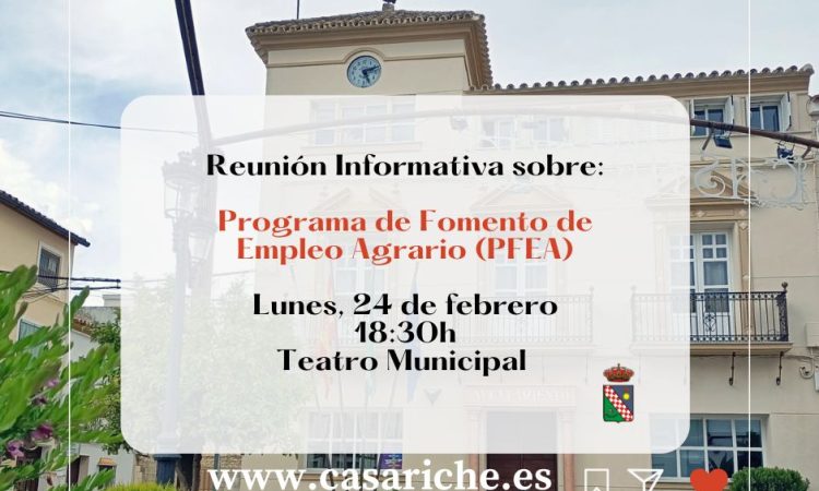 El lunes 24 de febrero, a las 18:30h, se celebrará en el Teatro Municipal una reunión informativa sobre las novedades en el procedimiento de selección del Programa de Fomento de Empleo Agrario (PFEA).