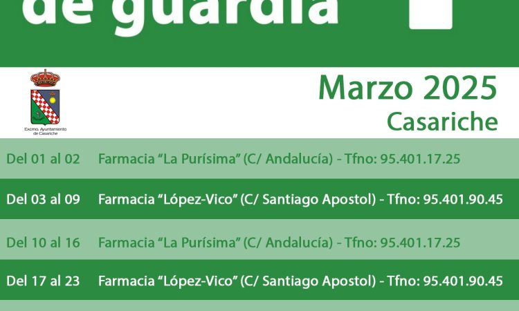 Este primer fin de semana de marzo estará de guardia la farmacia «La Purísima», en la Calle Andalucía, en horario de 09:30h de la mañana a 22:00h.