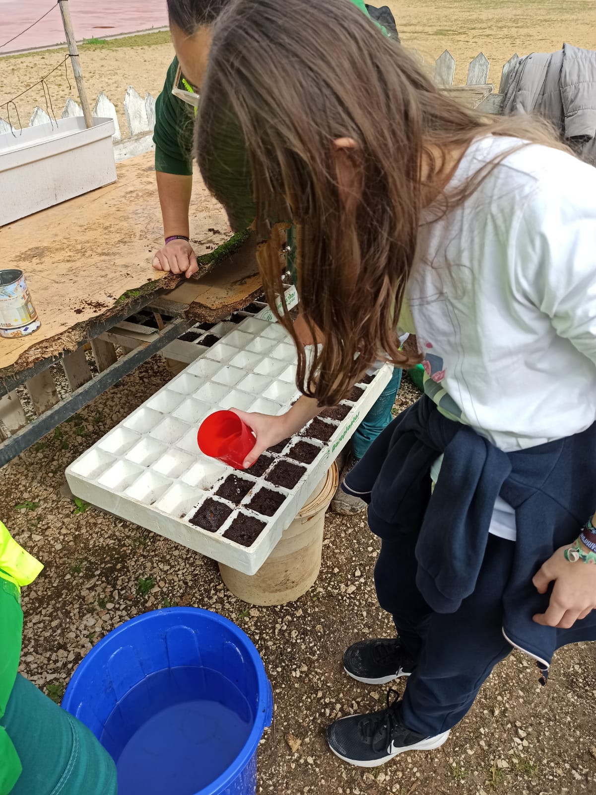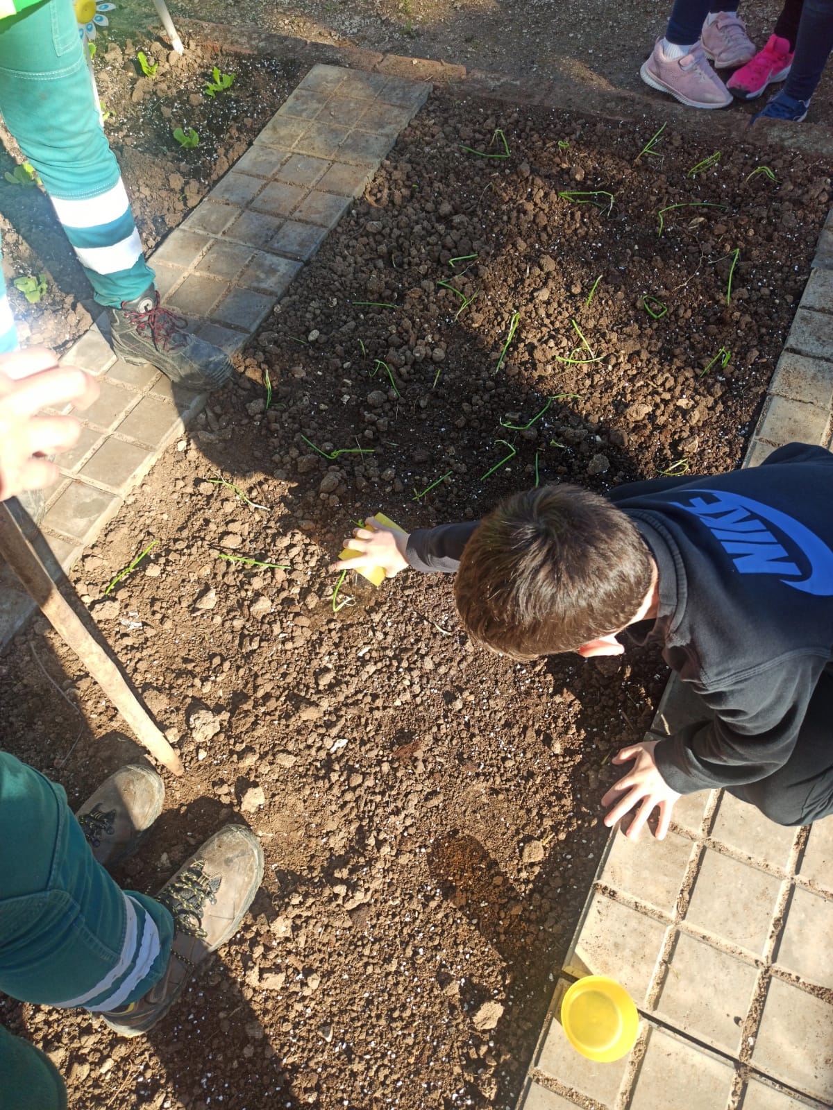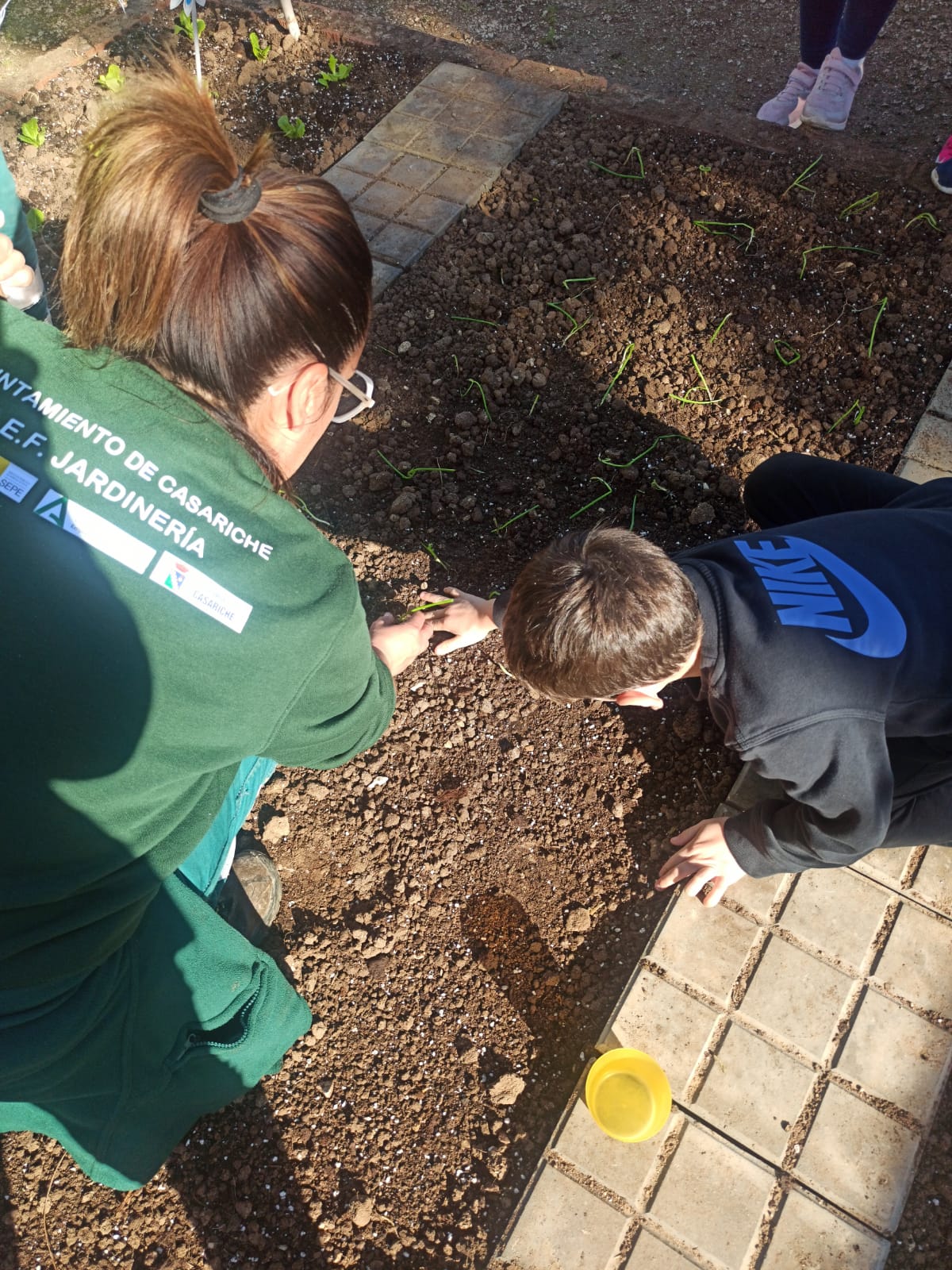 Sigue su curso el trabajo semanal en el huerto escolar del CEIP Lope de Vega. La semana pasada el alumnado de 3ºA y 1ºB participó en una sesión de siembra en el terreno de cebollas y en semilleros de tomate pera y esta semana se han sembrado en semilleros pimientos rojos y albahaca, con las clases de 5°A e Infantil 4 Años A.