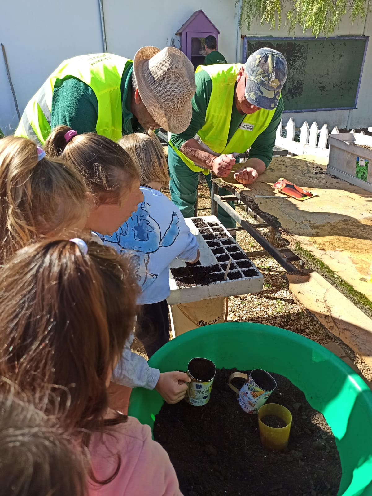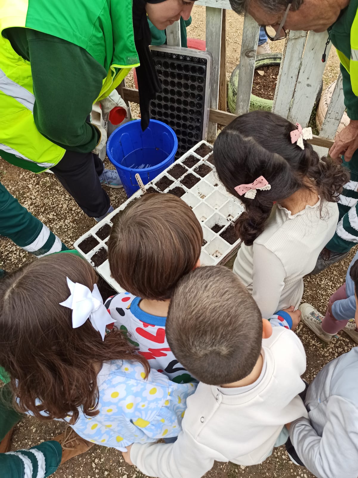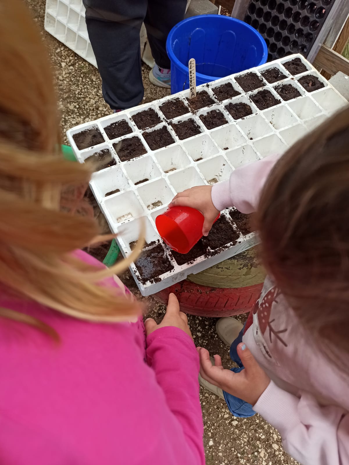 Sigue su curso el trabajo semanal en el huerto escolar del CEIP Lope de Vega. La semana pasada el alumnado de 3ºA y 1ºB participó en una sesión de siembra en el terreno de cebollas y en semilleros de tomate pera y esta semana se han sembrado en semilleros pimientos rojos y albahaca, con las clases de 5°A e Infantil 4 Años A.