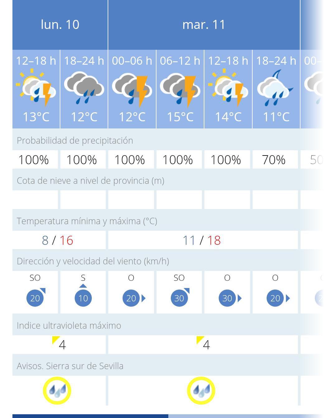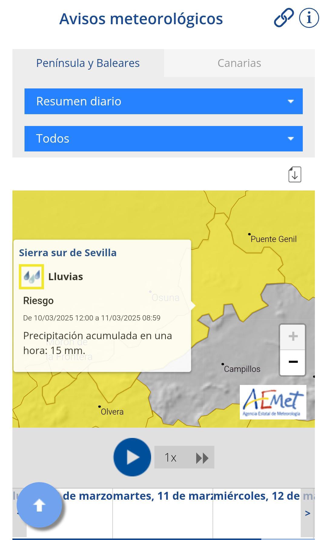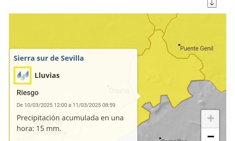 El Ayuntamiento informa que, de acuerdo a la información facilitada por la Agencia Estatal de Meteorología, AEMET, se ha activado una alerta amarilla por lluvias en la Sierra Sur de Sevilla, desde hoy que se mantendrá activa hasta las 08:59h de mañana martes, 11 de marzo.