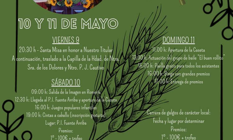 20:30h: Santa Misa en honor a San Isidro Labrador. A continuación, traslado de la Capilla de la Hdad. de Ntra. Sra. de los Dolores y Ntro. Padre Jesús Cautivo.