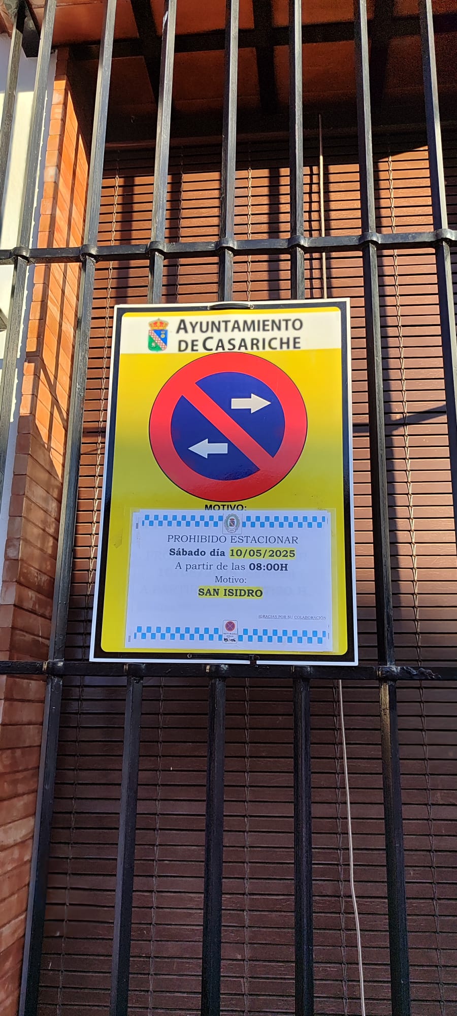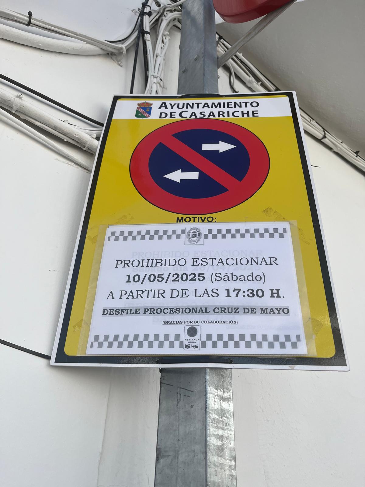 La Policía Local de Casariche ya ha instalado las señales de prohibición de estacionamiento correspondientes a la procesión de la Santa Cruz y del inicio de la Romería de San Isidro, que tendrán lugar mañana sábado 10 de mayo.