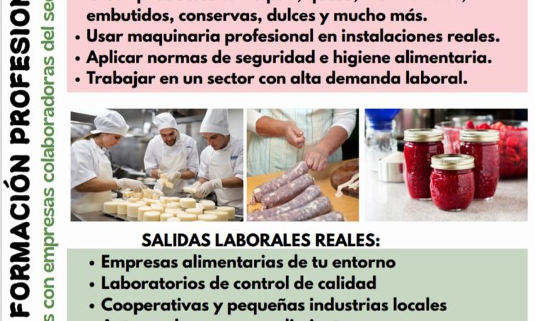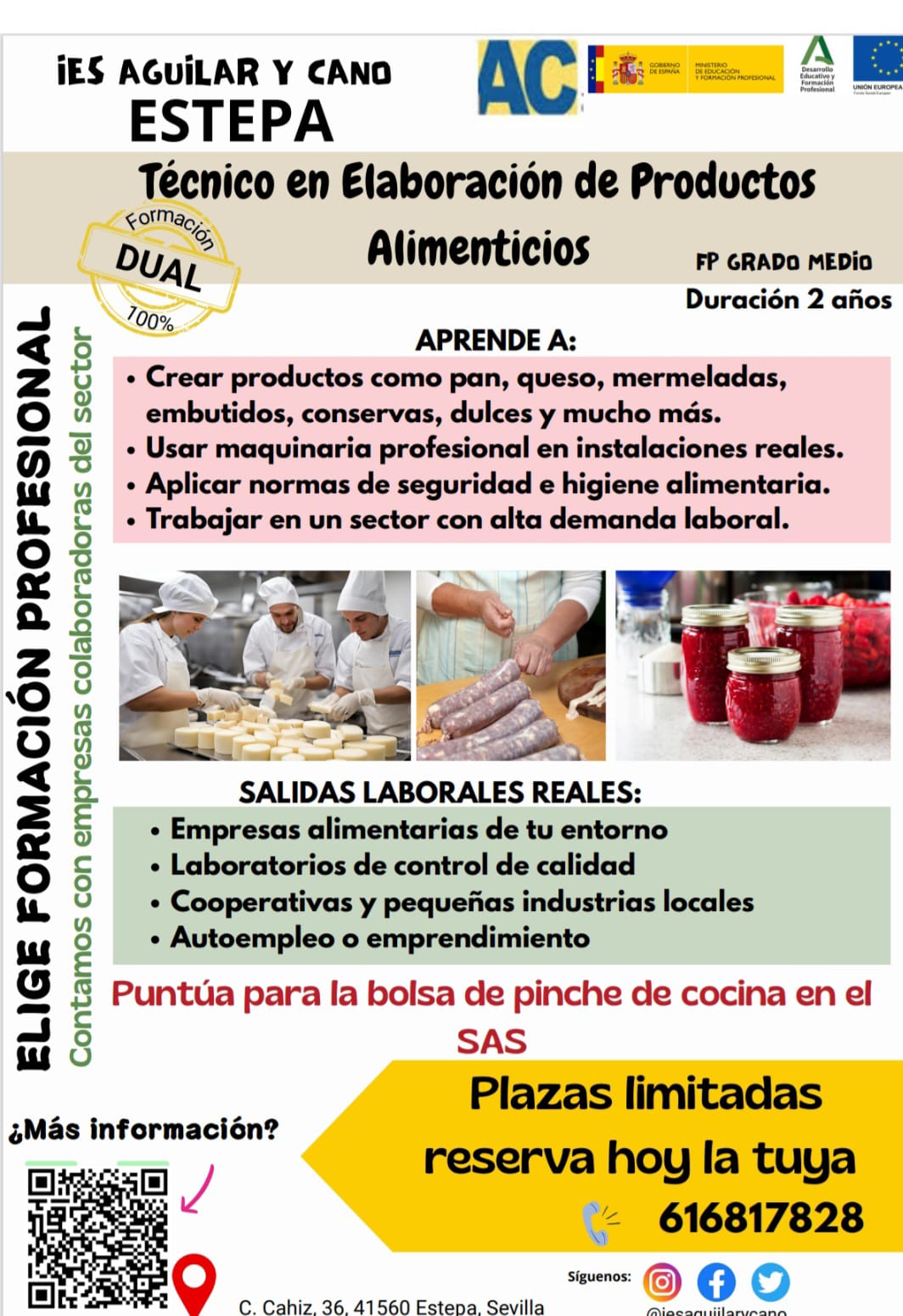 Desde el IES Aguilar y Cano de Estepa nos informan de que ya está abierto el plazo de inscripción para el Ciclo Formativo de Grado Medio en Elaboración de Productos Alimenticios, con una duración de 2 años y una clara orientación práctica hacia la industria alimentaria.
