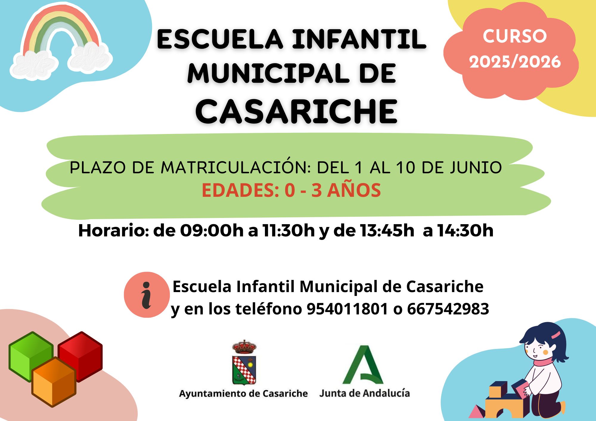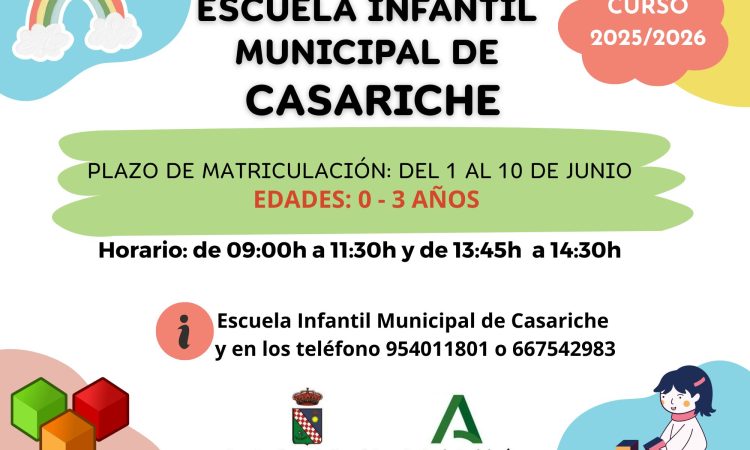 La Escuela Infantil Municipal de Casariche (Guardería) informa que el plazo de matriculación para el curso 2025/2026 estará abierto del 1 al 10 de junio, en horario de 09:00h a 11:30h y de 13:45h a 14:30h.