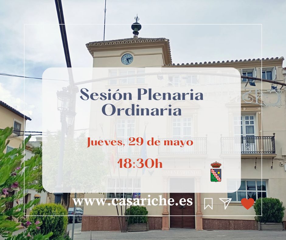 Informamos a todos nuestros vecinos y vecinas que mañana jueves, 29 de mayo a las 18:30h de la tarde se celebrará una nueva sesión plenaria de carácter ordinario en el Salón de Plenos Municipal, cuyo orden del día es el siguiente:
