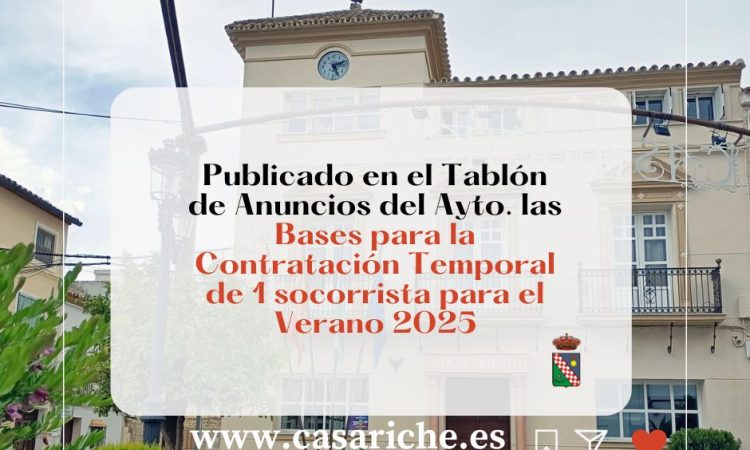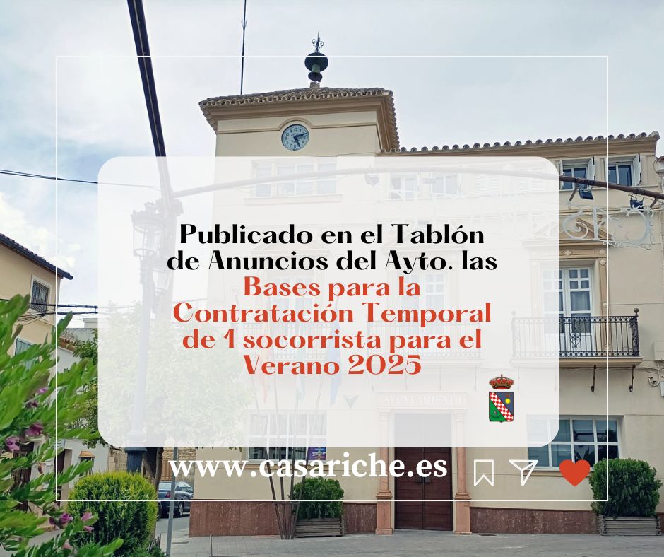 Desde la Delegación de Empleo informamos que ya se pueden consultar tanto en el Tablón de Anuncios del Ayuntamiento así como en el E- tablón las Bases para la Contratación Temporal de un/a Socorrista para el verano 2025.