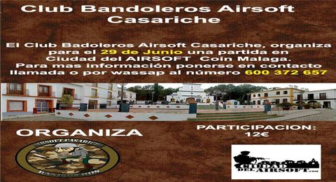 El Club Deportivo Casaricheño «Bandoleros Airsoft Casariche», organiza este fin de semana una partida en la Ciudad del Airsoft de Coin (Málaga), que tendrá lugar el domingo 29 de junio. Las partidas comenzarán a las 9:00 horas, teniendo que estar los jugadores a las 8:00 para organizar el evento y finalizarán a las 18:00 horas, disponiendo los jugadores de 2 horas para el almuerzo.