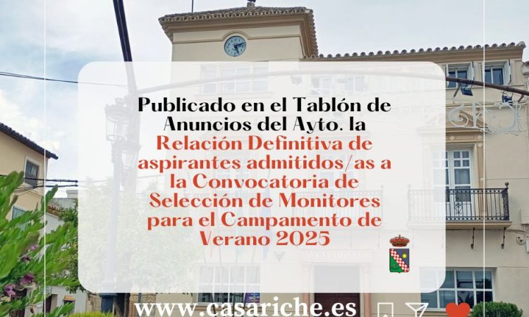 Desde la Delegación de Empleo informamos a todos los vecinos y vecinas de Casariche que ya está disponible, tanto en el Tablón de Anuncios de nuestro Ayuntamiento como en el E-tablón, la Relación Definitiva de Aspirantes para la Convocatoria para la Selección de Monitores para el Campamento de Verano 2025
