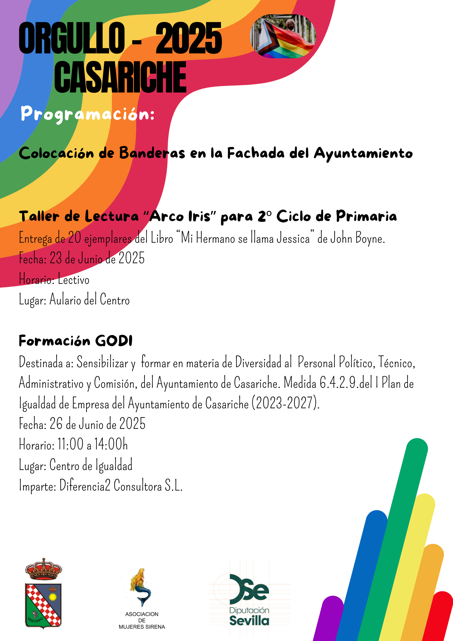 Además, esta semana se colocarán banderas en la fachada del Ayuntamiento y también se va a impartir una formación GODI destinada a sensibilizar y formar en materia de Diversidad al Personal Político, Técnico, Administrativo y Comisión del Ayuntamiento de Casariche. Esta acción formativa está enmarcada en el I Plan de Igualdad de Empresa de nuestro Ayuntamiento (2023-2027) y se celebrará de 11:00h a 14:00h en el Centro de Igualdad este jueves 26 de junio.