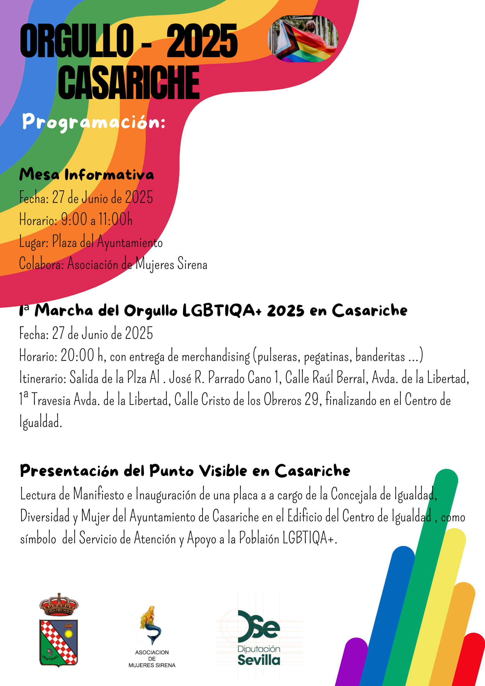El Ayuntamiento de Casariche, a través de la Delegación de Igualdad, Diversidad y Mujer, presenta la programación del Orgullo 2025, cuyo acto central se celebrará el viernes 27 de junio, pero que contempla también algunas actividades previas dirigidas a visibilizar y apoyar los derechos del colectivo LGBTIQA+ en nuestro municipio.