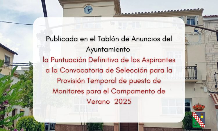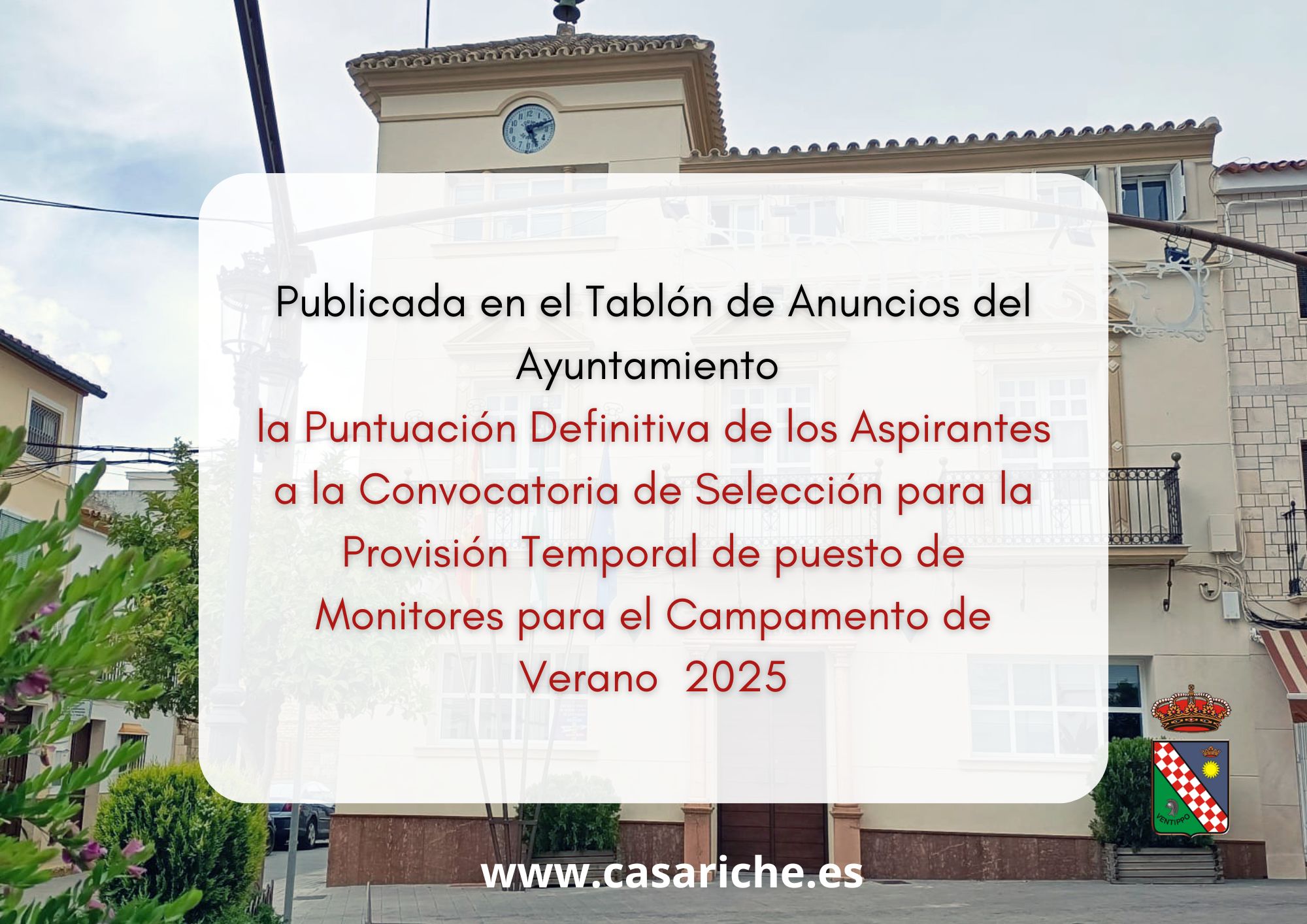 Desde la Delegación de Empleo informamos a todos los vecinos y vecinas de Casariche que ya está disponible, tanto en el Tablón de Anuncios de nuestro Ayuntamiento como en el E-tablón, la Puntuación Definitiva de los Aspirantes a la Convocatoria de Selección para la Provisión Temporal de puesto de Monitores para el Campamento de Verano 2025