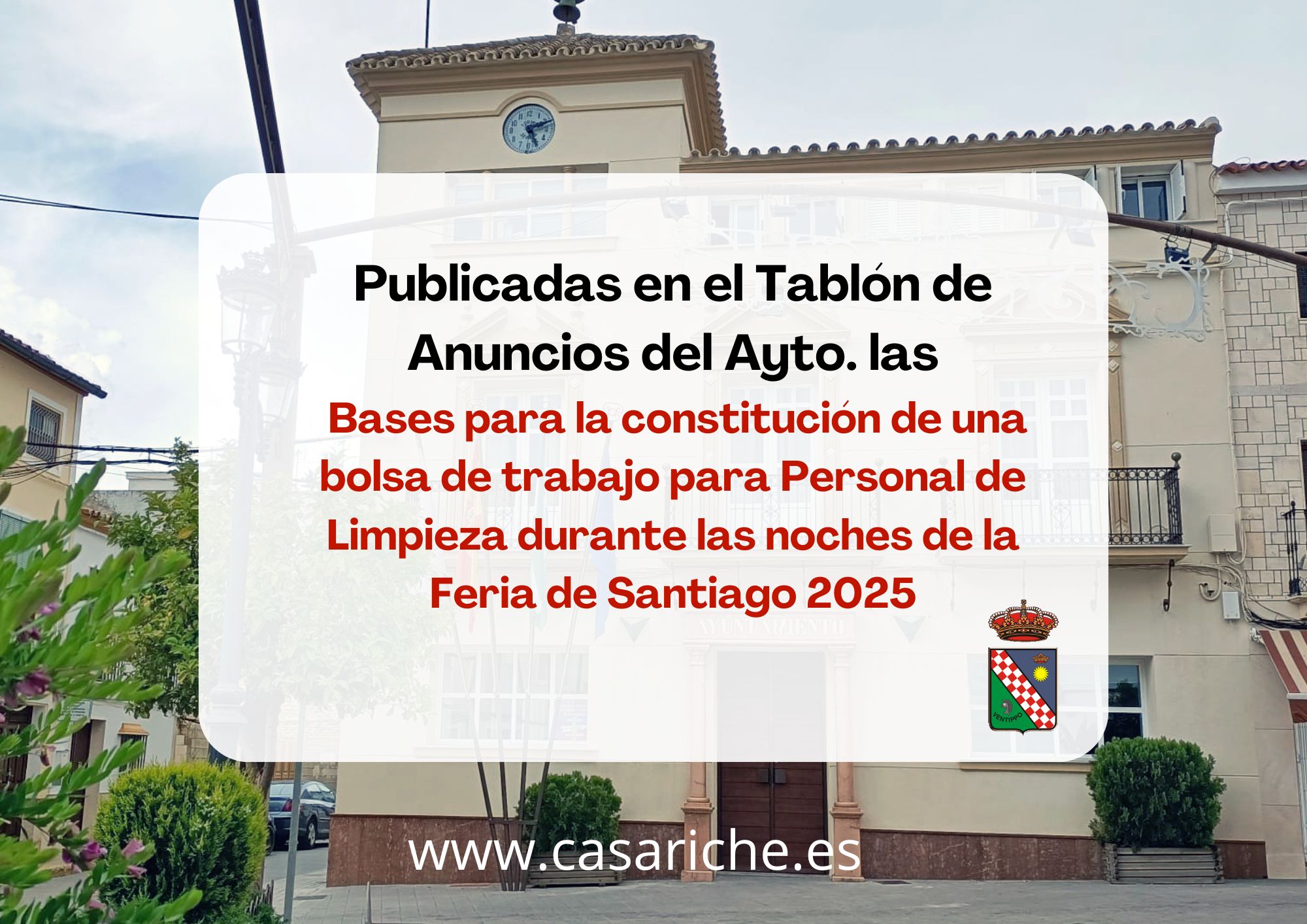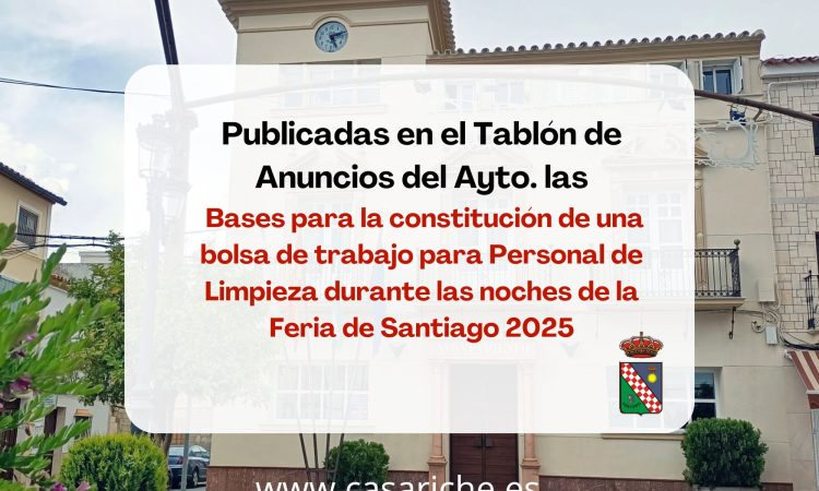 Desde la Delegación de Empleo informamos que ya se pueden consultar tanto en el Tablón de Anuncios del Ayuntamiento así como en el E- tablón las Bases de la Convocatoria para la constitución de una bolsa de trabajo para la contratación en la modalidad de duración determinada, siendo la temporalidad de los contratos de una semana, para el desempeño del puesto de Personal de Limpieza durante las noches de la Feria de Santiago 2025.