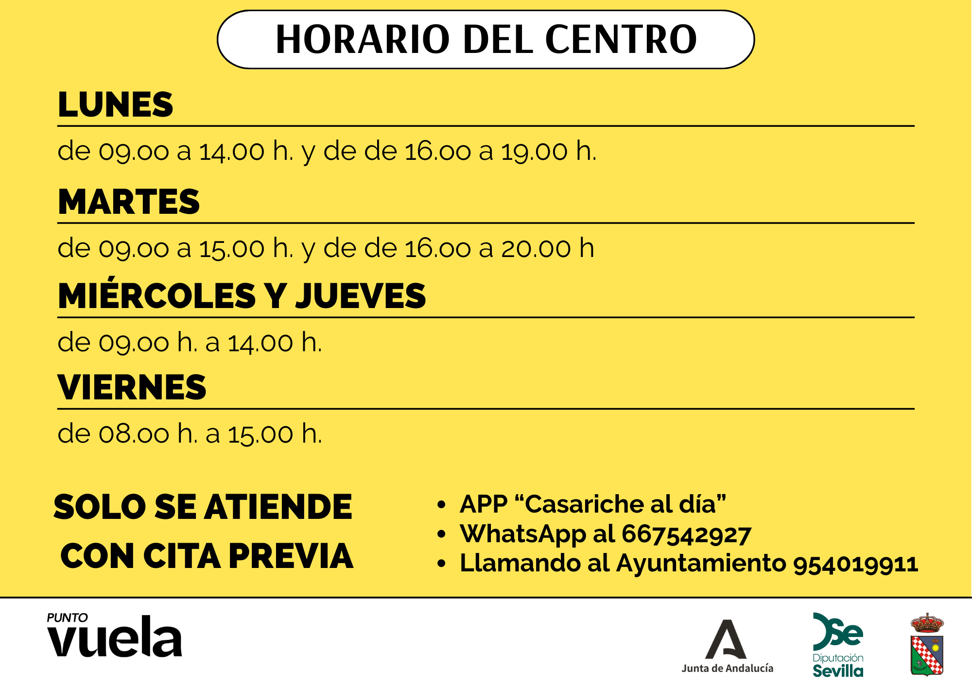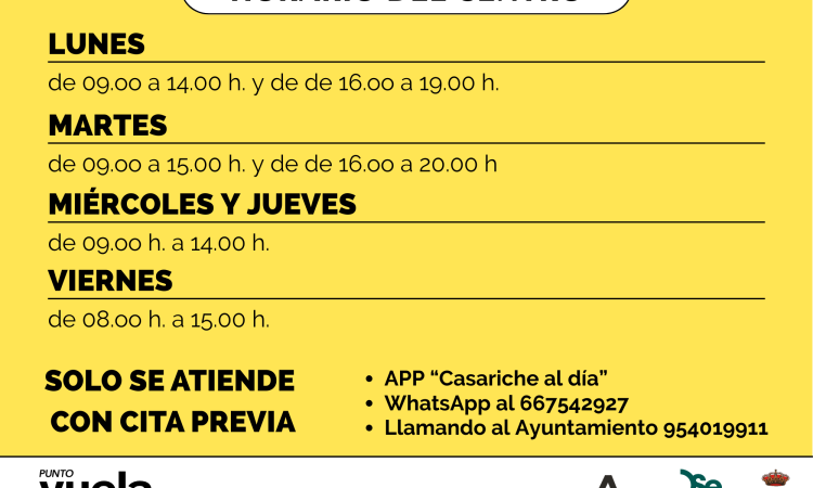 Recordamos que para ser atendido/a en el Punto Vuela de Casariche es necesario tener cita previa, que puede obtenerse a través de la APP ‘Casariche al día’, del whatsapp al 667 54 29 27 o llamando al Ayuntamiento al 954019911.