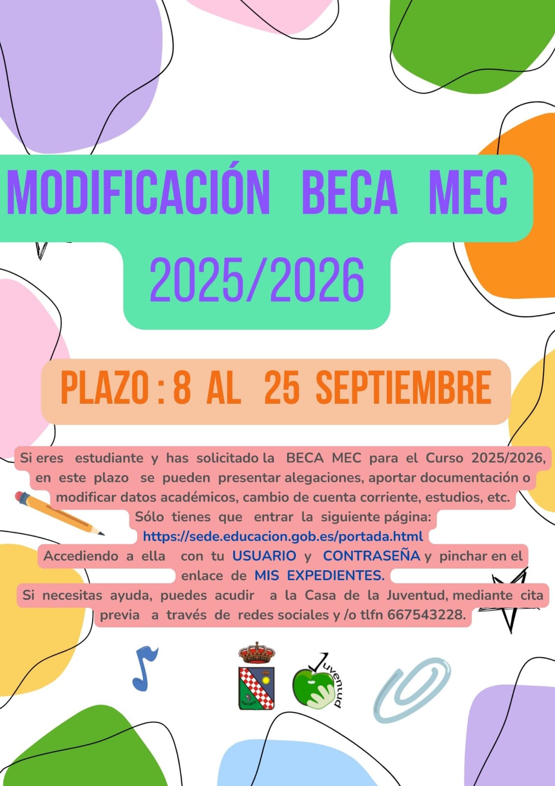 Si necesitas orientación o tienes dudas sobre el proceso, puedes acudir a la Casa de la Juventud, mediante cita previa a través de redes sociales o llamando al 667543228, donde recibirás ayuda personalizada para gestionar tu beca correctamente.