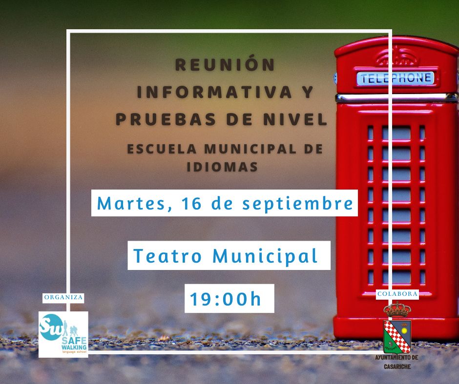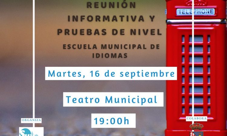 Informamos que mañana martes, 16 de septiembre a las 19:00h de la tarde en el Teatro Municipal se va a celebrar la reunión informativa y las pruebas de nivel pertinentes para la posterior asignación de horarios y grupos de todas las personas matriculadas en la Escuela Municipal de Idiomas en este curso 2025 – 2026.