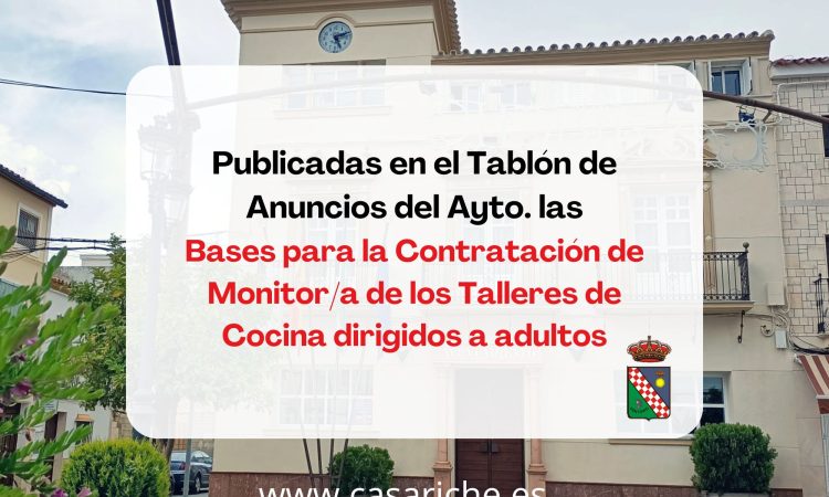 Desde la Delegación de Empleo informamos que se han publicado tanto en el Tablón de Anuncios del Ayuntamiento como en el E-Tablón las Bases para la Contratación de Monitor/a para impartir los Talleres de Cocina dirigidos a adultos.