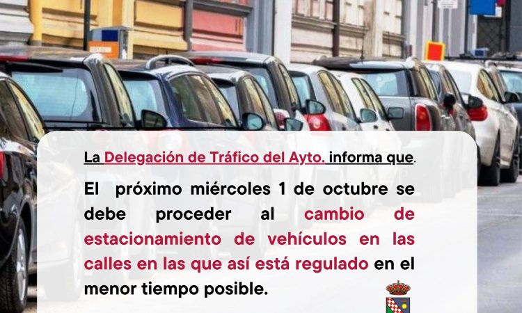 La Delegación de Tráfico del Ayuntamiento recuerda a todos los vecinos y vecinas del municipio que este miércoles 1 de octubre se realizará el cambio de estacionamiento en las calles en las que así está regulado y, que por lo tanto, deberán cambiar sus vehículos lo más pronto posible.