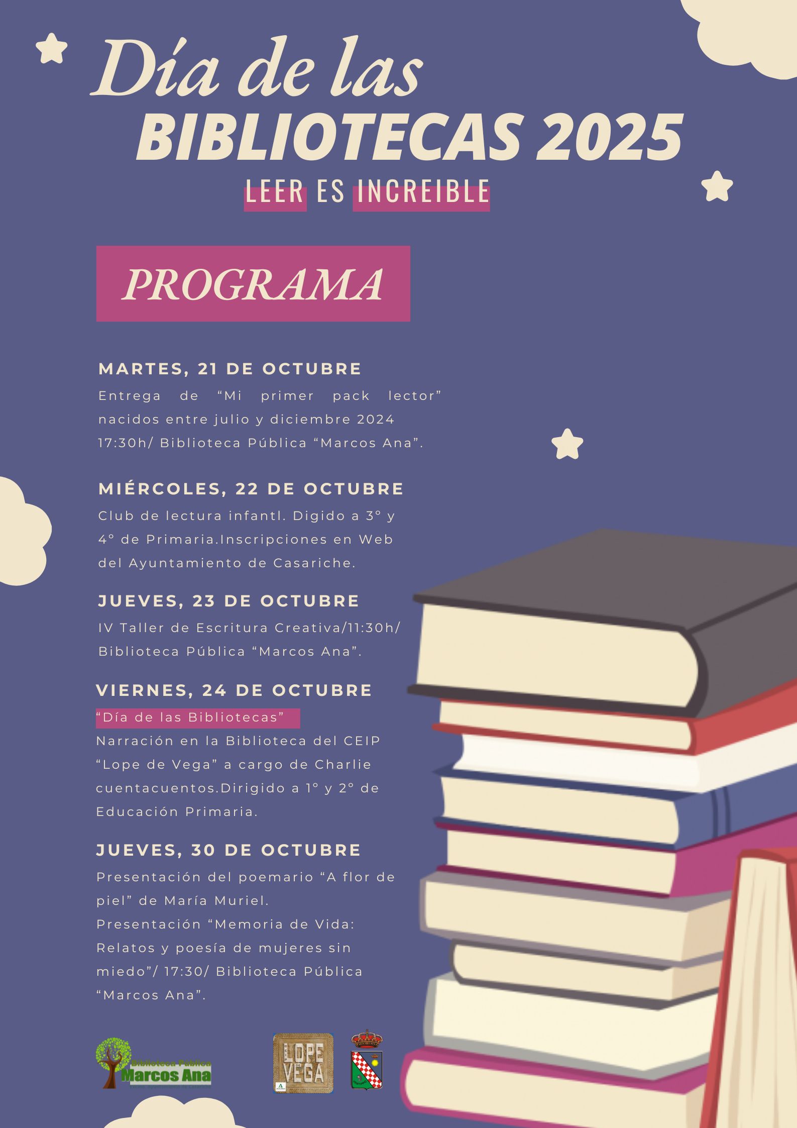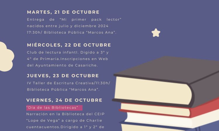 Desde el Ayuntamiento de Casariche y la Biblioteca Publica Municipal Marcos Ana se invita a todos los vecinos y vecinas a participar en esta programación, que rinde homenaje al papel esencial de las bibliotecas como espacios de encuentro, cultura y creatividad.
