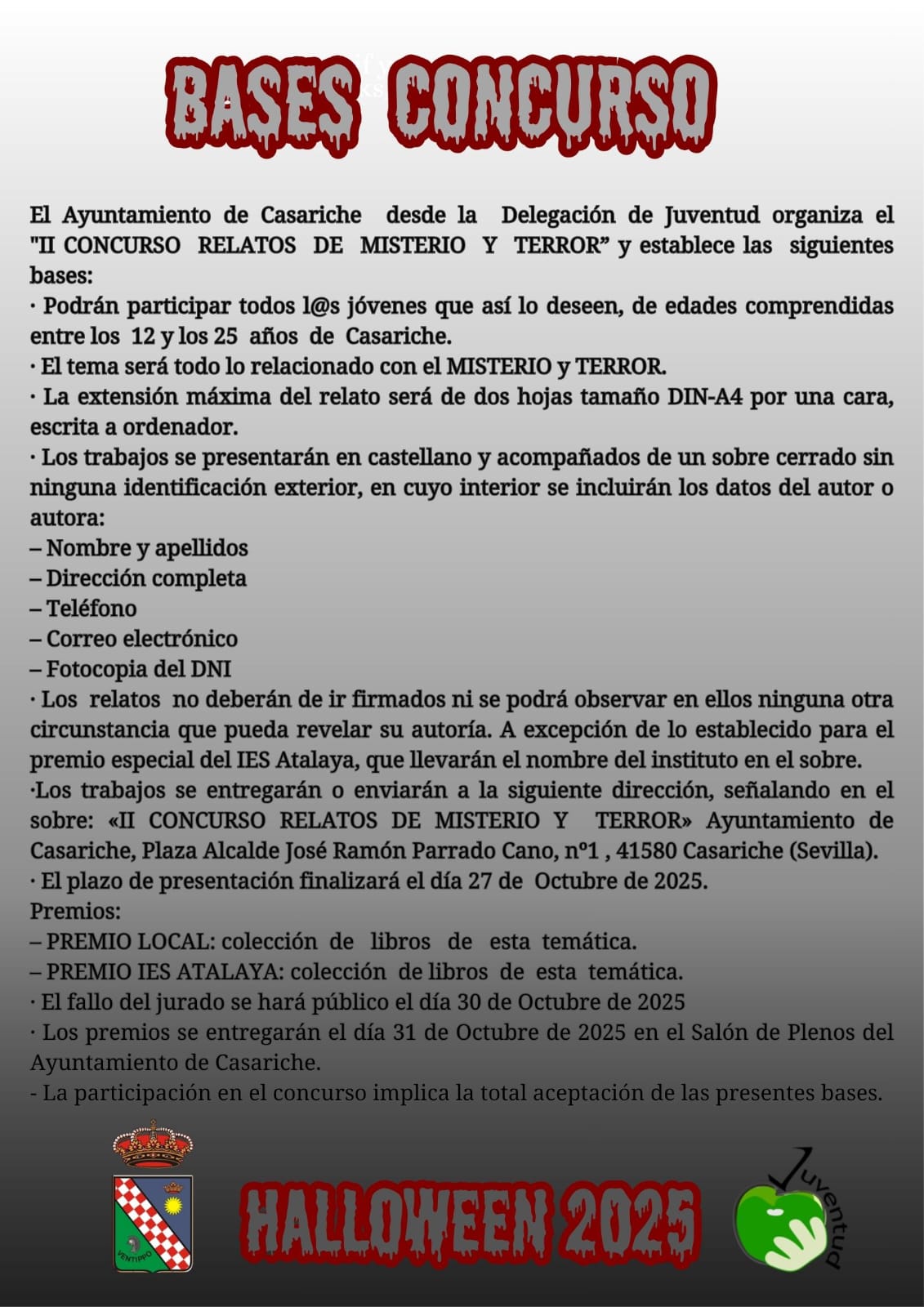 Dentro de la programación especial organizada por nuestro Ayuntamiento para conmemorar Halloween 2025, este año damos continuidad al II Concurso de Relatos de Misterio y Terror, un certamen literario impulsado por la Delegación de Juventud, que está dirigido a jóvenes de entre 12 y 25 años de Casariche que quieran poner a prueba su imaginación y su talento escribiendo un relato que gire en torno al misterio y el terror, los grandes protagonistas de esta época del año.