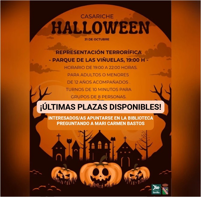 Si todavía estás interesado/a en apuntarte a nuestra Representación Terrorífica de Halloween el próximo 31 de octubre, todavía estás a tiempo de hacerte con alguna de las últimas plazas disponibles, acudiendo a la Biblioteca Municipal ‘Marcos Ana’ y preguntando por Mari Carmen Bastos.