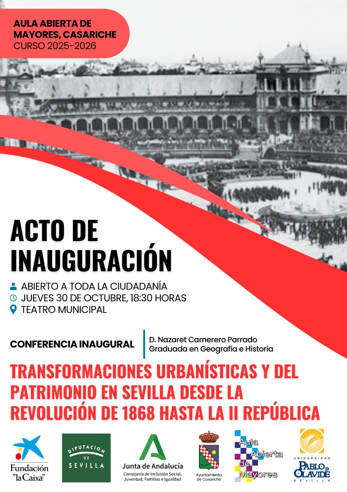 Este acto, abierto al público, contará con una conferencia inaugural titulada “Transformaciones urbanísticas y del patrimonio en Sevilla desde la Revolución de 1868 hasta la II República”, que será impartida por Nazaret Carnerero Parrado, Graduada en Geografía e Historia.