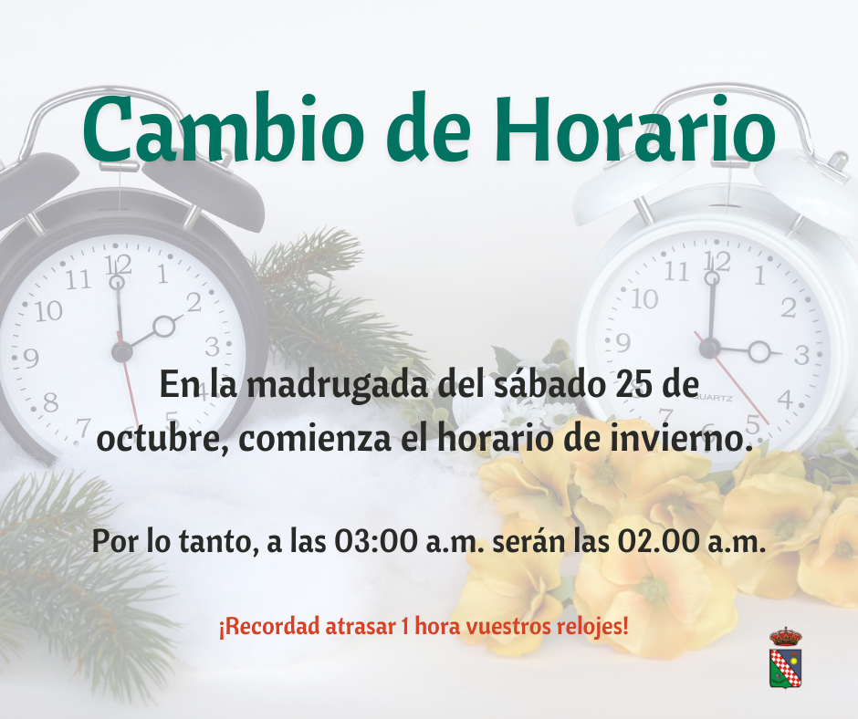 Desde el Ayuntamiento de Casariche recordamos a todos los vecinos/as que, en la madrugada del sábado 25 al domingo 26 de octubre se realizará el cambio al horario de invierno. Por lo tanto, a las 03:00 de la madrugada, los relojes deberán atrasarse una hora, pasando a ser las 02:00 a.m.