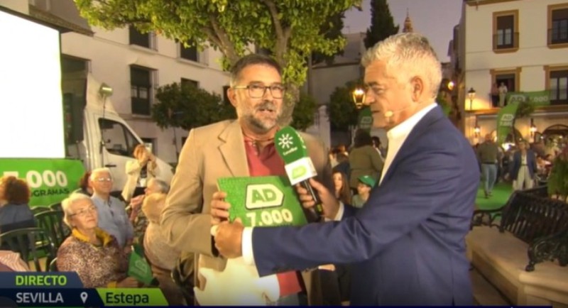 La entrega del mismo se realizó durante la emisión en directo celebrada ayer, 21 de octubre, desde la Plaza del Carmen de Estepa, lugar elegido para la conmemoración de este hito televisivo andaluz. El encargado de hacer entrega del mosaico fue nuestro vecino, José Juan Quesada Pérez.