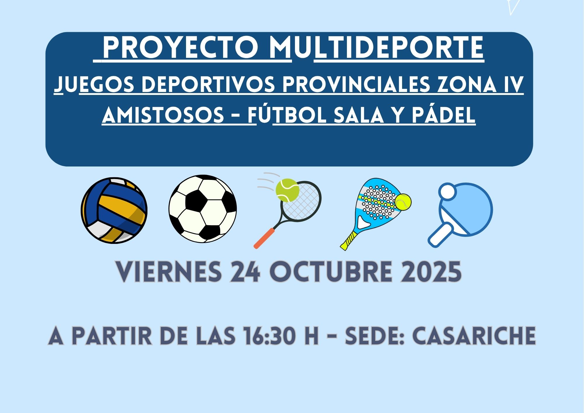 El viernes 24 por la tarde, también en Casariche, continúa la actividad con encuentros amistosos del Proyecto Multideporte. Nuestros deportistas participarán en partidos de fútbol sala infantil, y en enfrentamientos de pádel en las categorías prebenjamín, benjamín, alevín y cadete.