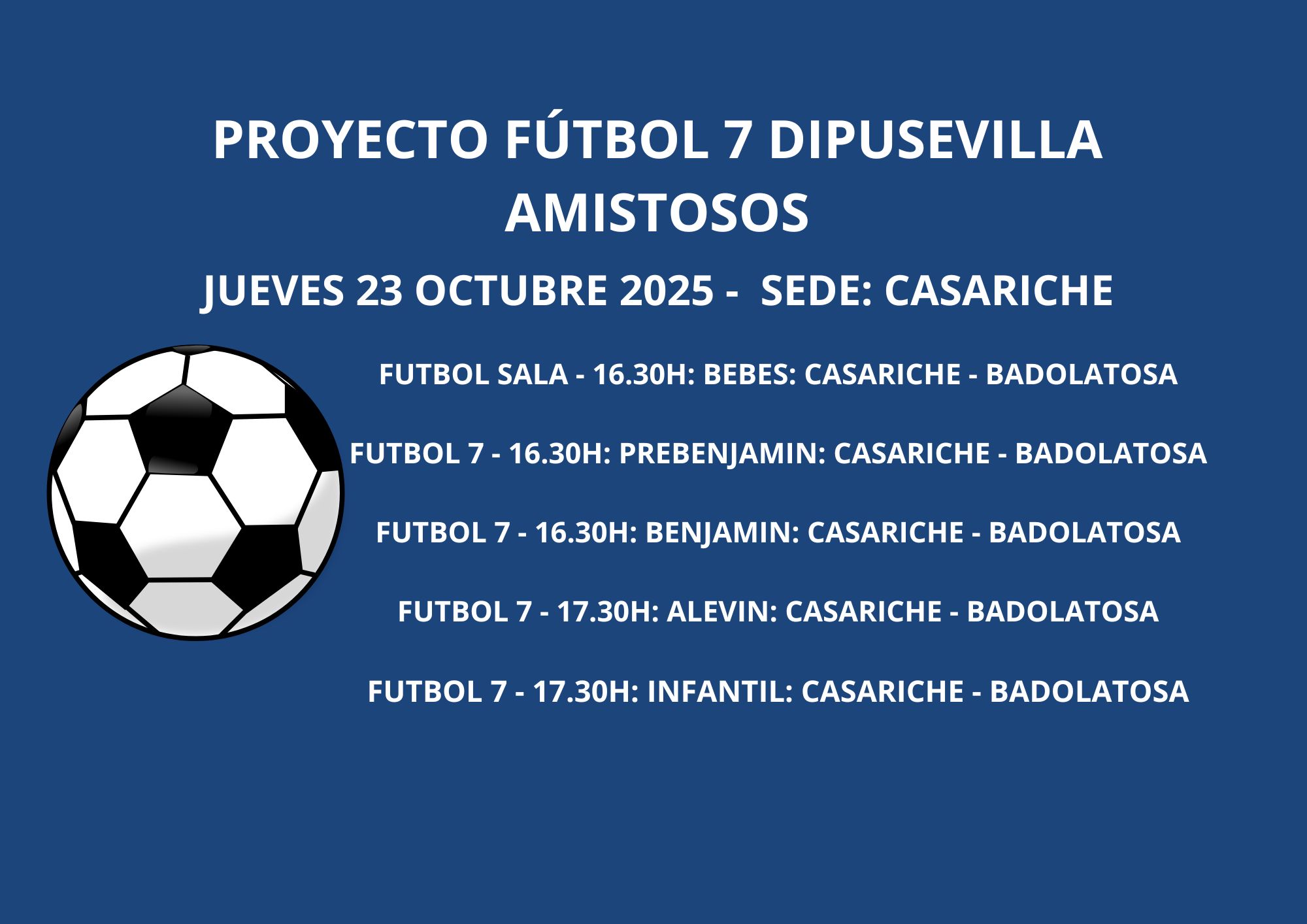 La semana arranca con una jornada de amistosos mañana jueves 23, a partir de las 16:30 h, en el campo municipal Sergio Carnerero Gil con los encuentros de la Escuela de Fútbol de Casariche en las categorías bebé, prebenjamín, benjamín, alevín e infantil.