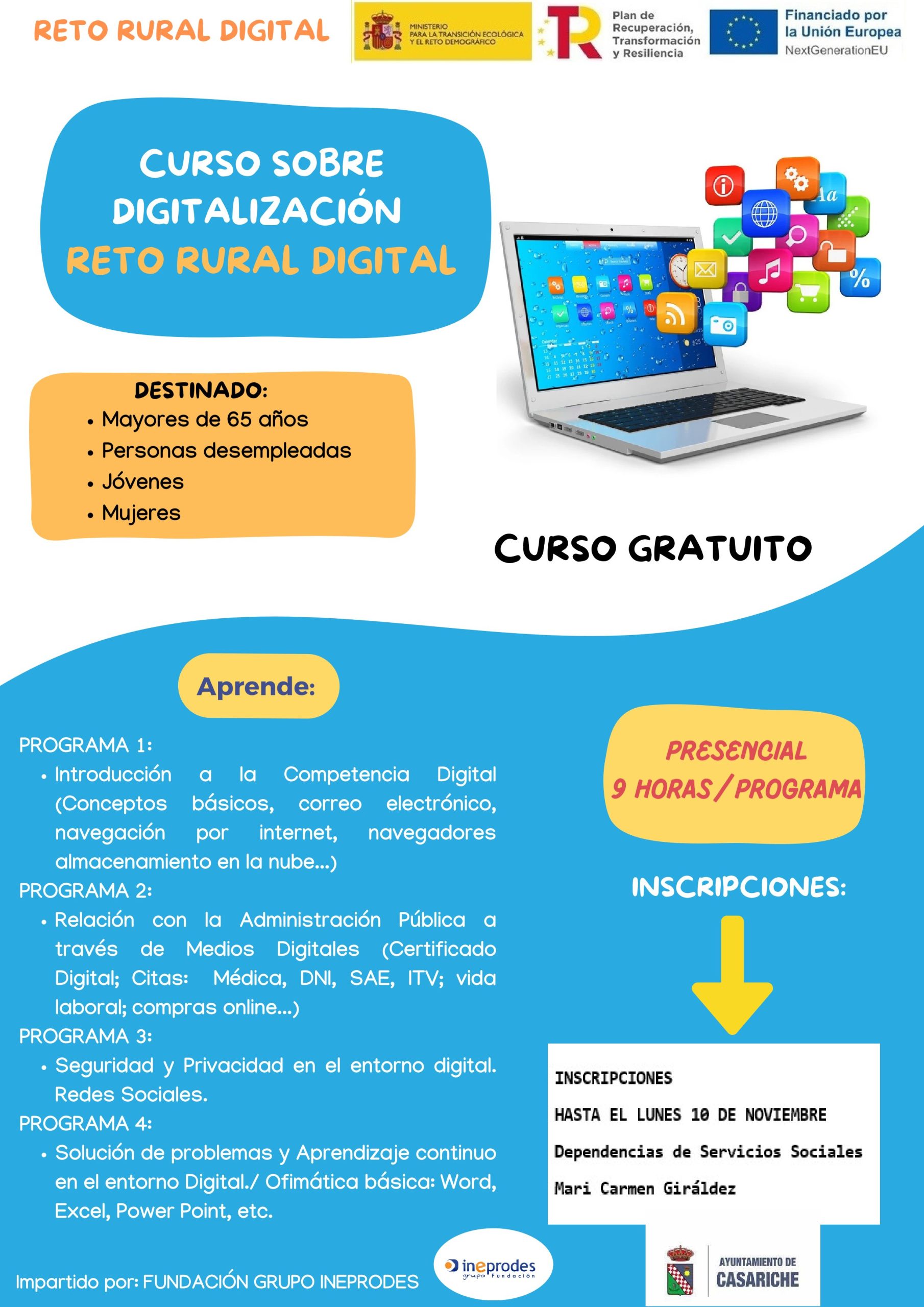 Este curso, de carácter presencial y gratuito, está impartido por la Fundación Grupo Inerprodes y se desarrollará en sesiones de 9 horas por programa o bloque, abordando cuatro diferentes: Introducción a la Competencia Digital, Relación con la Administración Pública a través de medios digitales, Seguridad y privacidad en el entorno digital y Solución de Problemas y Aprendizaje Continuo en el entorno digital.