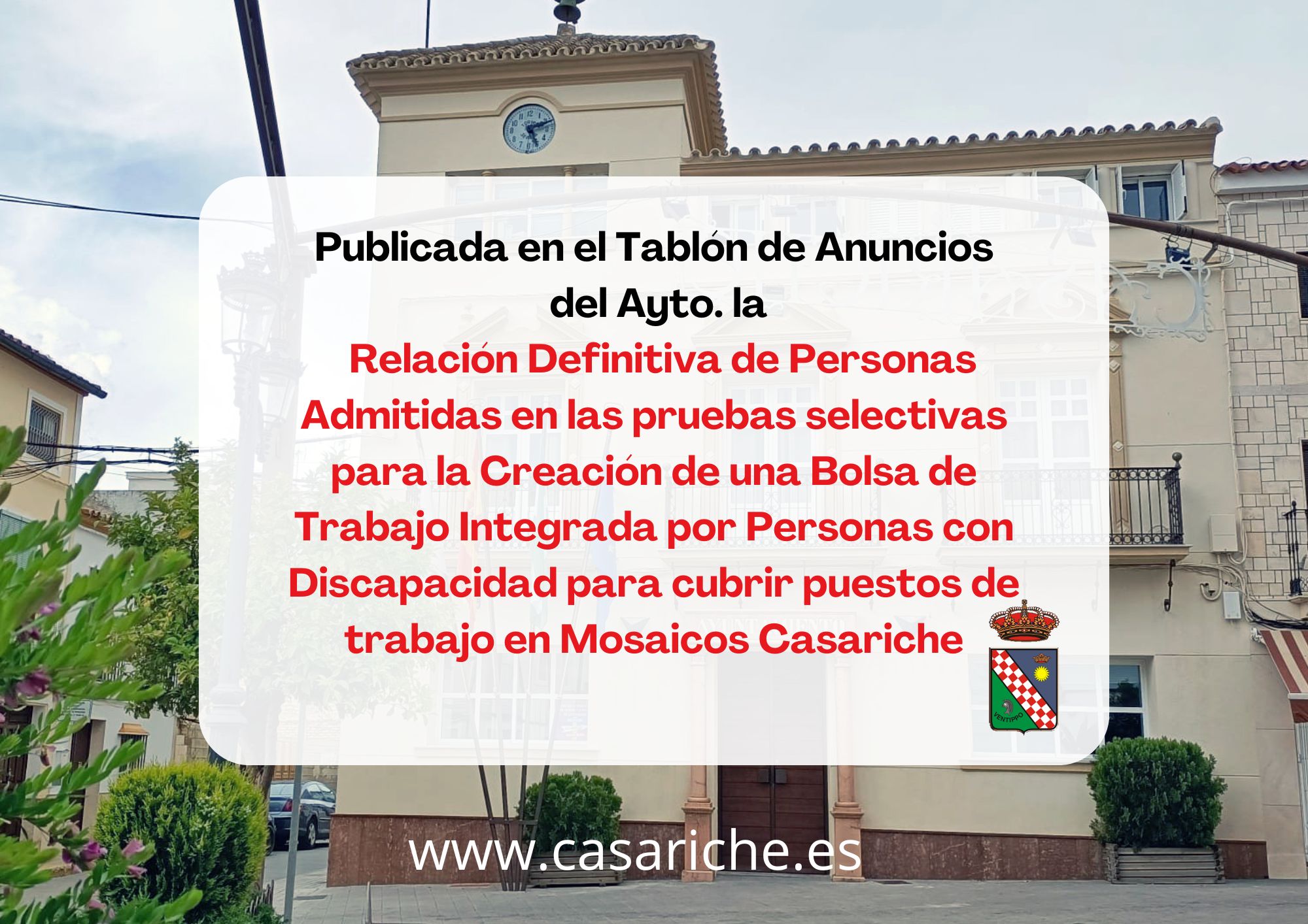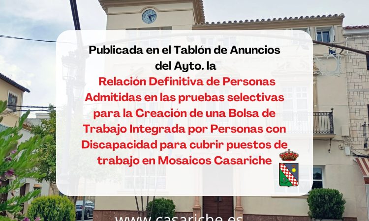 Desde la Delegación de Empleo informamos que se ha publicado tanto en el Tablón de Anuncios del Ayuntamiento como en el E-Tablón la Relación Definitiva de Personas Admitidas en las pruebas selectivas para la Creación de una Bolsa de Trabajo Integrada por Personas con Discapacidad para cubrir puestos de trabajo por circunstancias de la producción y sustitución de persona trabajadora, de Operario de Elaboración de Mosaicos en el Centro Especial de Empleo, Mosaicos Casariche, S.L.U.