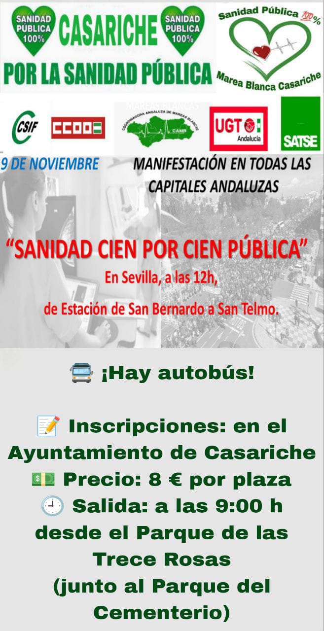 Desde nuestro pueblo, habrá servicio de autobús organizado Marea Blanca Casariche para facilitar la asistencia de nuestros vecinos y vecinas a esta manifestación, que saldrá el domingo 9 a las 09:00h desde el Parque de las Trece Rosas a un coste de 8€ por plaza.