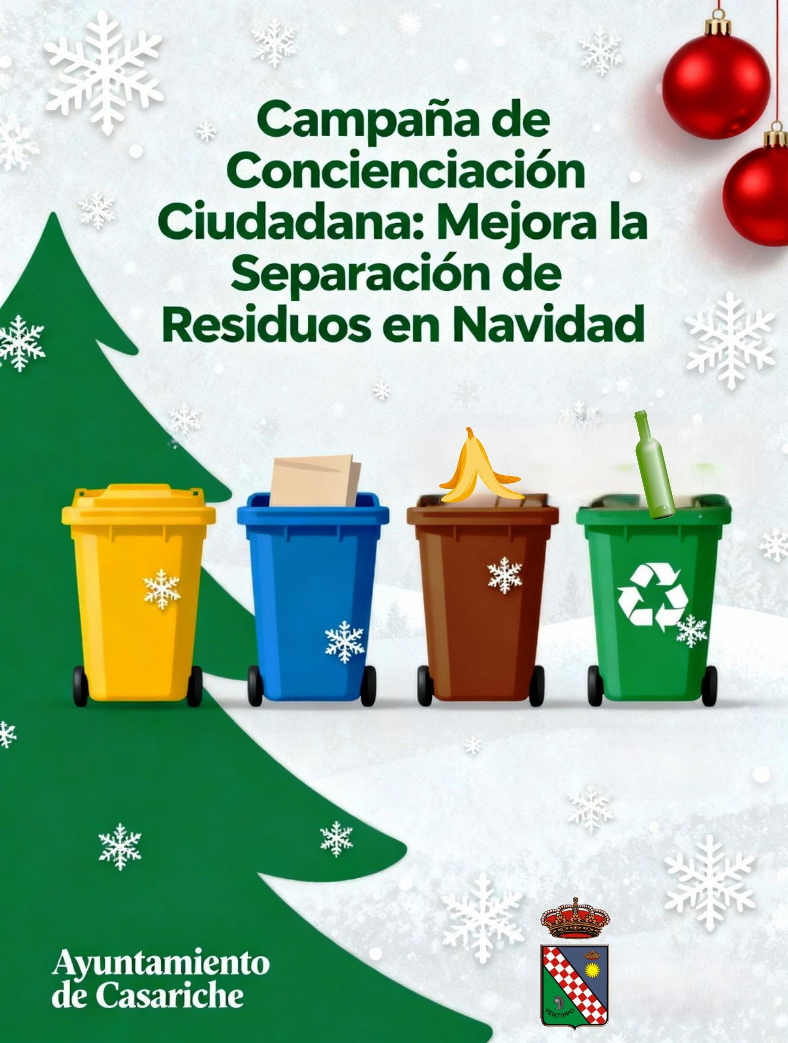 Con esta campaña, el Ayuntamiento de Casariche hace un llamamiento a toda la ciudadanía para que, especialmente durante la Navidad, recicle de manera responsable y contribuya a mantener la localidad limpia, reforzando así el compromiso colectivo con el cuidado del medioambiente y la calidad de vida de nuestro municipio.