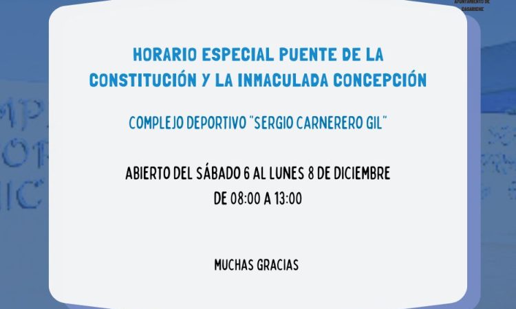 Desde la Delegación de Deportes se informa a todos los vecinos/as de la localidad que con motivo de la festividad del Día de la Constitución y de la Inmaculada Concepción el Complejo Deportivo «Sergio Carnerero Gil» abrirá del sábado 6 al lunes 8 de diciembre de 08:00h a 13:00h, permaneciendo cerrado durante la jornada de tarde.
